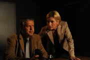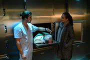 Böser WolfBenedikt Förster (Florian Wünsche, l.) informiert Selma Kirsch (Yve Burbach, r.) über die genaue Todesursache von Simon Waldeck (Komparse, M.)Bild: © ZDF und Markus-Fenchel.