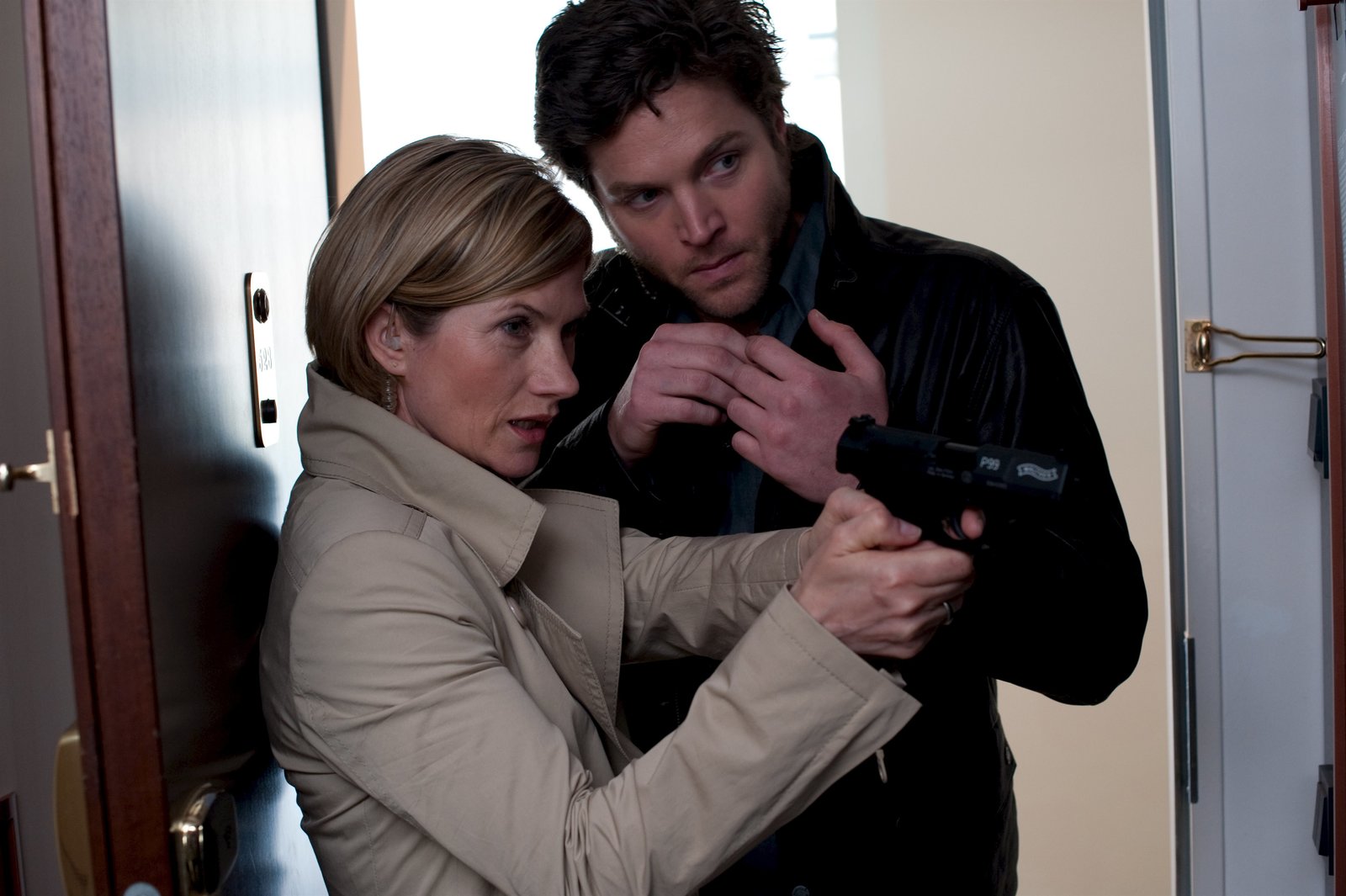 FankurveMartina Seiffert (Astrid M. Fünderich) und Jo Stoll (Peter Ketnath) haben die Hotelzimmertür aufgebrochen und kommen ihrer Kollegin Anna zu Hilfe.Bild: © ZDF und Markus Fenchel