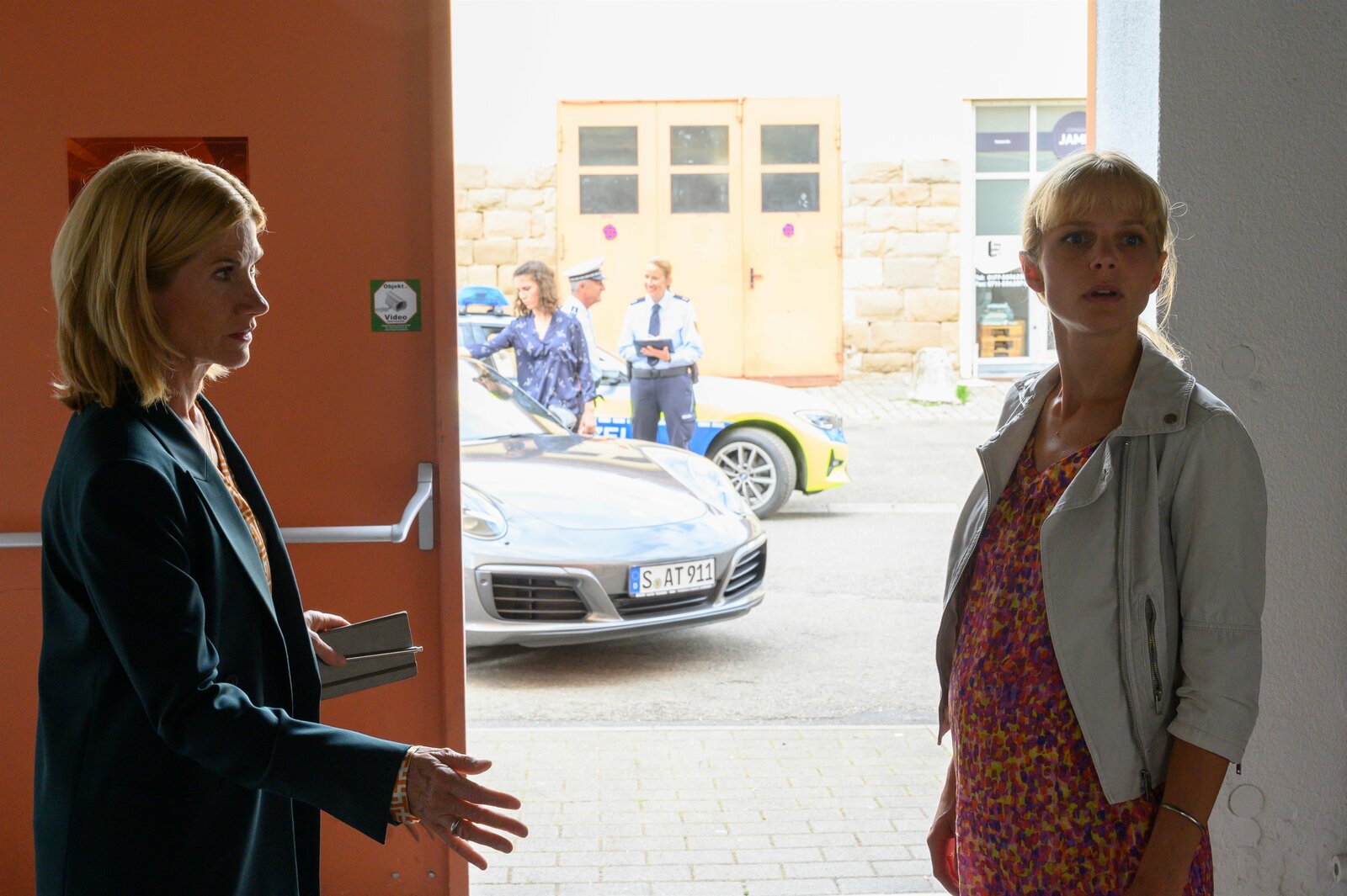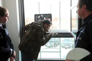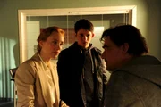 Das Sterben der NashörnerKommissar Jo Stoll (Peter Ketnath, l.) befragt die Kassiererin Agnes Försching (Ina Paule Klink, r.). Zoltan Radovic (Adrian Can, M.) beobachtet das Geschehen durch das Fenster.Bild: © ZDF und Markus Fenchel./Markus Fenchel