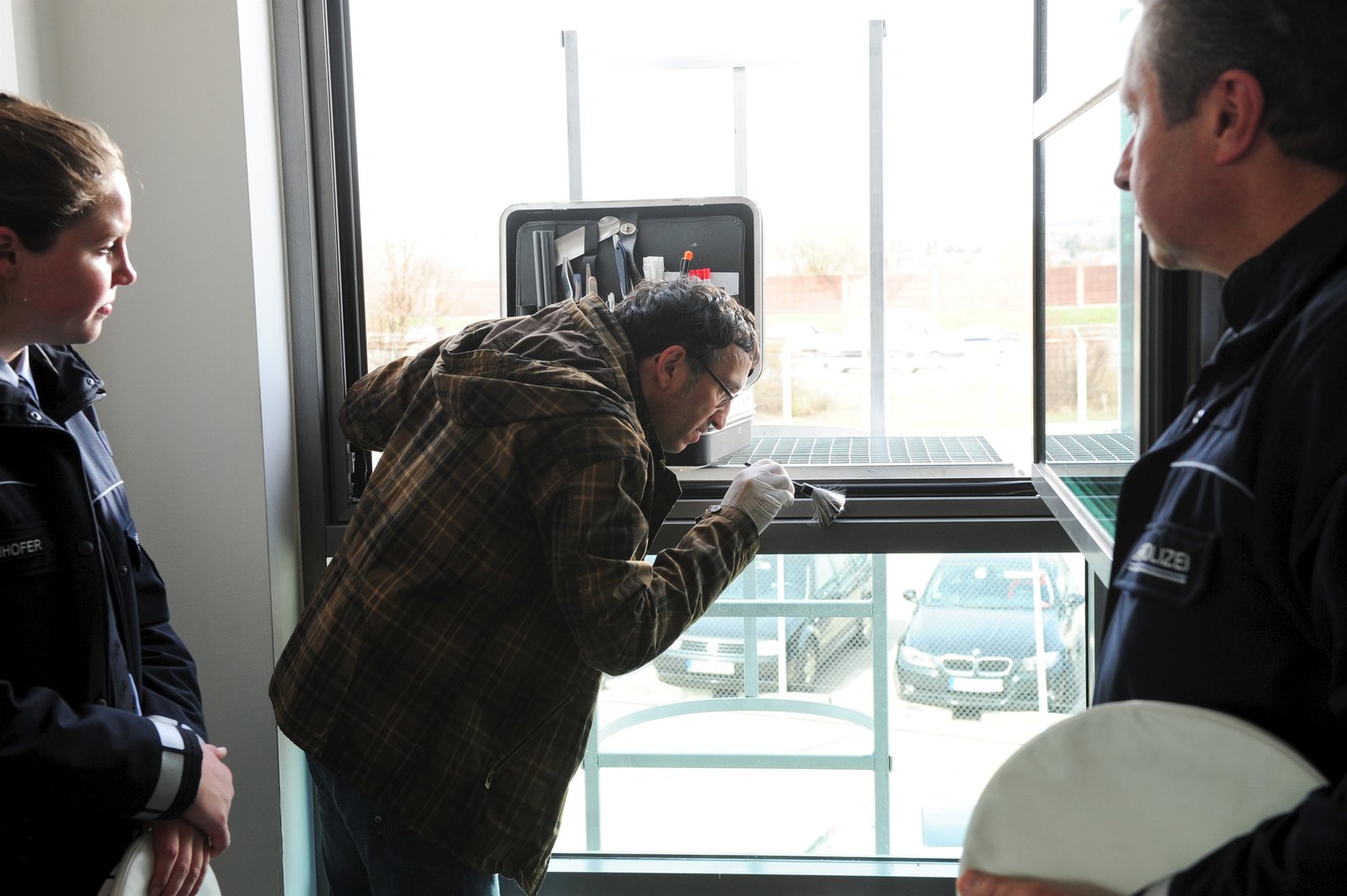 Tödliche KarriereUnter den wachsamen Augen zweier Streifenbeamten sichert Spusi-Chef Jan Arnaud (Mike Zaka Sommerfeldt, M.) Spuren an einem Notausgang.Bild: © ZDF und Markus Fenchel