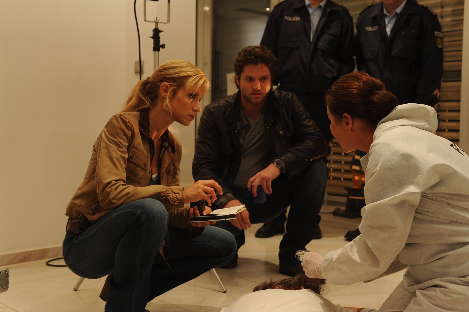 PlaceboeffektDer Homöopathie-Unternehmer Gerald Goldbach (Thomas Bading, l.) ist fassungslos: Galt ihm in Wirklichkeit der Giftanschlag, bei dem ein Homöopathie-Gegner ermordet wurde? Warum sonst sollten seine Globuli vergiftet worden sein, welche die Spurensicherung (Komparse) sichergestellt hat? Jo Stoll (Peter Ketnath, r.) hat einige Fragen.Bild: © ZDF und MARKUS_FENCHEL.