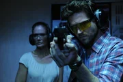 Bei Einschluss MordÜbung macht den Meister – Die Kommissare Jo Stoll (Peter Ketnath) und Selma Kirsch (Yve Burbach) halten sich mit Schussübungen fit.Bild: © ZDF und MARKUS-FENCHEL studiofenchel@web