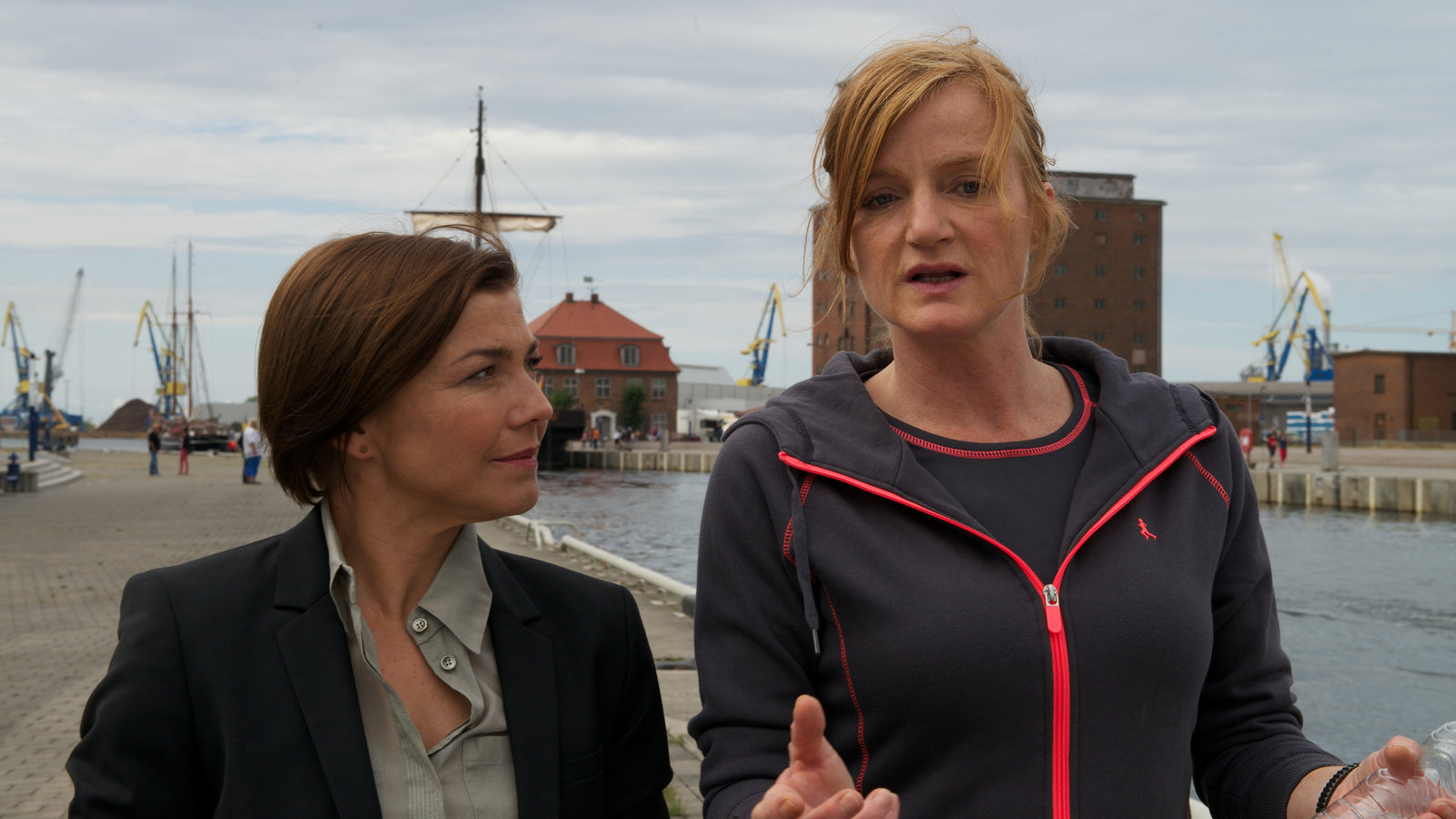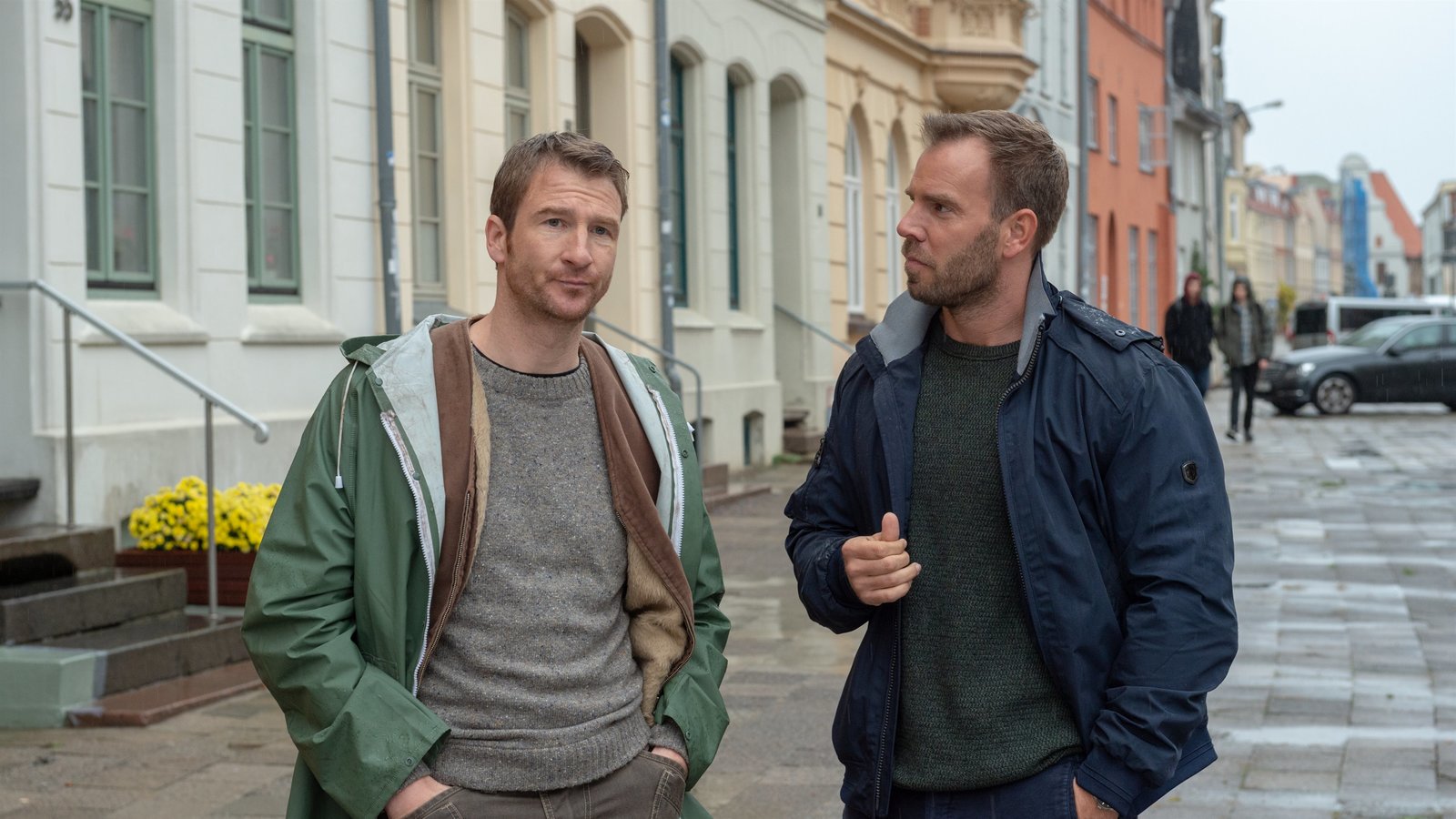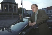 Katz und MausRike (Anna v. Berg) und Winnie (Martin Brambach) warten am Marktplatz von Wismar und beobachten Merow, den Vater der Entführten.Bild: © ZDF und Marc Meverbröker