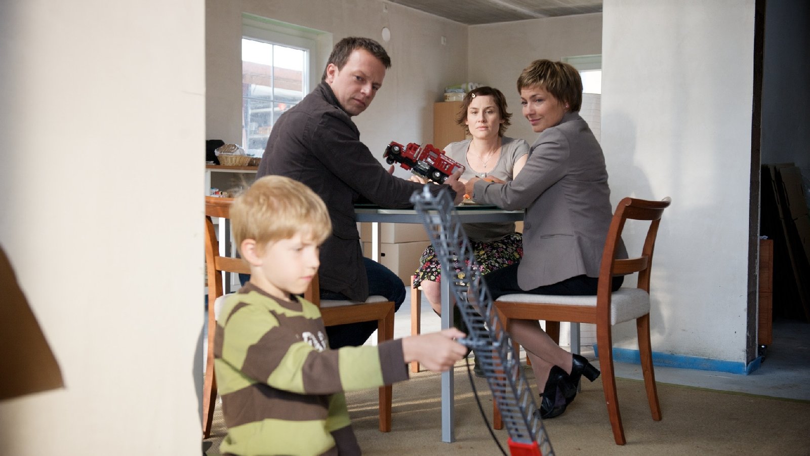EigenheimDie Ermittler erfahren von Doreen Scheurich, wie verzweifelt ihre Situation ist. Durch Damerows Betrug müssen sie in einer Bauruine leben. Sie haben Angst um die Gesundheit ihres kleinen Sohnes. Ist das Grund genug, um sich an Damerow zu rächen? Von links: Tobias Scheurich (Eric Wüst), Sven Herzog (Michael Härle), Doreen Scheurich (Daniela Holtz), Katrin Börensen (Claudia Schmutzler).Bild: © ZDF und Marc Meyerbroeker