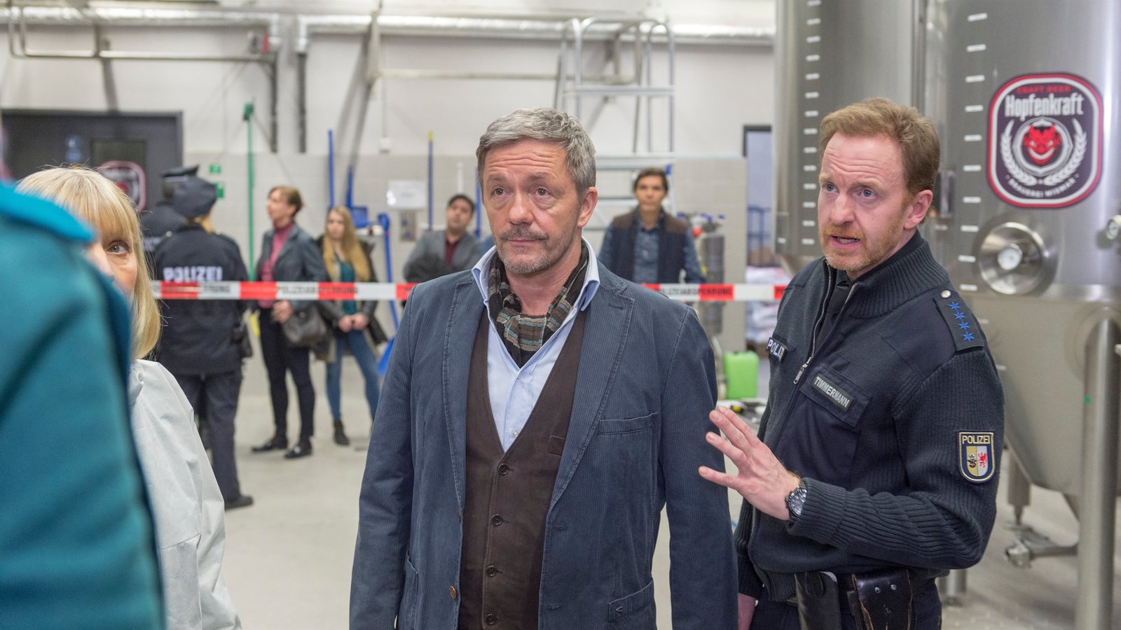 Der BierflüstererFür Holk Maischmann (Frank Logemann, M.), den Betreiber der Brauerei "Hopfenkraft" ist die Situation eine Katastrophe. Der tote Jens Schneller hat in seiner Funktion als Bierblogger immer gute Werbung gemacht. Doch ein Toter im Maischekessel wird die Nachfrage nach seinem selbst gebrauten Bier sicher nicht ankurbeln. Mit wem hat sich Bierblogger Jens Schneller angelegt? Oder soll der Tote Maischmann schaden?Bild: © ZDF und Marc Meyerbroeker.