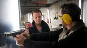 SchusslinieWährend auf dem Schießstand des Schützenvereins die Schüsse knallen, wird der Vorsitzende des Vereins, Hans Ackermann, ganz in der Nähe tot aufgefunden. Mit seiner eigenen Waffe wurde er vermutlich erschossen, die ist jedoch spurlos verschwunden. Nicht nur deshalb führt der erste Weg von Sven Herzog (Michael Härle, l.) in den Verein, wo er Vereinsmitglied Roth (Rainer Laupichler, r.) trifft.Bild: © ZDF und Marc Meyerbröker