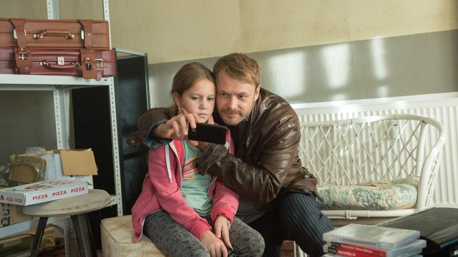 Überfall!Der Entführer (Matthias Ziesing, r.) hat Madita (Lilly Wagner, l.) in seiner Gewalt und übt per Handybotschaft Druck auf ihre Mutter aus. Bei Misslingen des Überfalls droht er damit, dem Mädchen etwas anzutun. Maditas Mutter in der Bank läuft die Zeit davon. Dann fällt überraschend ein Schuss.Bild: © ZDF / Marc Meyerbroeker Lizenzbild frei