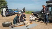 Lebe lieber unterirdischEin neuer Fall für die Kollegen Joost (Nike Fuhrmann, 2.v.l.), Pöhlmann (Dominic Boeer, r.), Timmermann (Mathias Junge, 3.v.l.) und Roswitha Prinzler (Silke Matthias, 2.v.r.): Jemand hat den improvisierten Wagenheber von Andreas Hidde (Marco Wittorf, l.) weggetreten. Der Mann ist von seinem eigenen Wagen zerquetscht worden. Doch wer ist so wütend auf den Mann gewesen? Warum musste Andreas Hidde sterben?Bild: © ZDF und ZDF / Meyerbroeker.