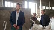 Der Hai auf dem DachDie Ermittlungen führen die Kommissare und Polizist Timmermann (Mathias Junge, l.) wieder zu Mario Kutter (Frederik Schmid, r.). Ist er der maskierte Mann, der von Sieghardt Sturbeck das Geld mit Gewalt gefordert hat? Ist sein Hass gegen seine Vater nur gespielt und steckt er in Wirklichkeit mit ihm unter einer Decke? Doch warum sollte er ihn dann umgebracht haben?Bild: © Sat.1 Emotions
