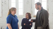 Taxi-BluesKaroline Joost (Nike Fuhrmann, r.) muss nun auch Alexandras schwangere Tochter Ella (Josepha Walter, l.) benachrichtigen. Die junge Frau ist am Boden zerstört, als sie vom Tod ihrer Mutter erfährt. Ihr Freund René (Eugen Bauder, M.) versucht, ihr in der schwierigen Zeit beizustehen.Bild: © ZDF / Marc Meyerbroeker Lizenzbild frei