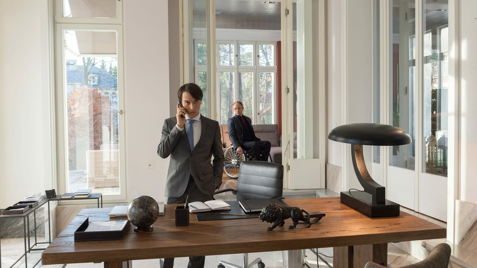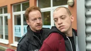Über die PlankeLars Pöhlmann (Dominic Boeer, l.) befragt Fabian Schimanski (Alexander Becht, r.). Der ist schwer getroffen vom Tod seiner Freundin Merle Stegemann (Magdalena Höfner, nicht im Bild). Aber warum ist Merle am Tatabend nicht nach Hause gekommen? Ist die Beziehung am Ende doch nicht so harmonisch gewesen, wie Fabian vorgibt?Bild: © ZDF und Marc Meyerbröker.