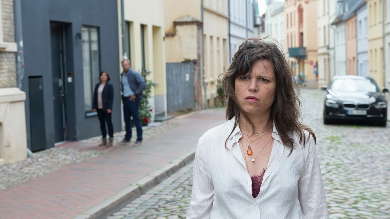 EheversprechenVor dem Haus des Ehepaars Nölitz torkelt eine unbekannte Frau (Lucie Muhr, r.) an den Kommissaren Katrin Börensen (Claudia Schmutzler, l.) und Lars Pöhlmann (Dominic Boeer, M.) vorbei. Erst später realisieren sie: Es war niemand Geringeres als Kristina Nölitz, die Ehefrau des Opfers. Diese weiß jedoch noch nichts vom Tod ihres Mannes. Kurz darauf verschwindet sie spurlos.Bild: © ZDF / Marc Meyerbroeker Lizenzbild frei