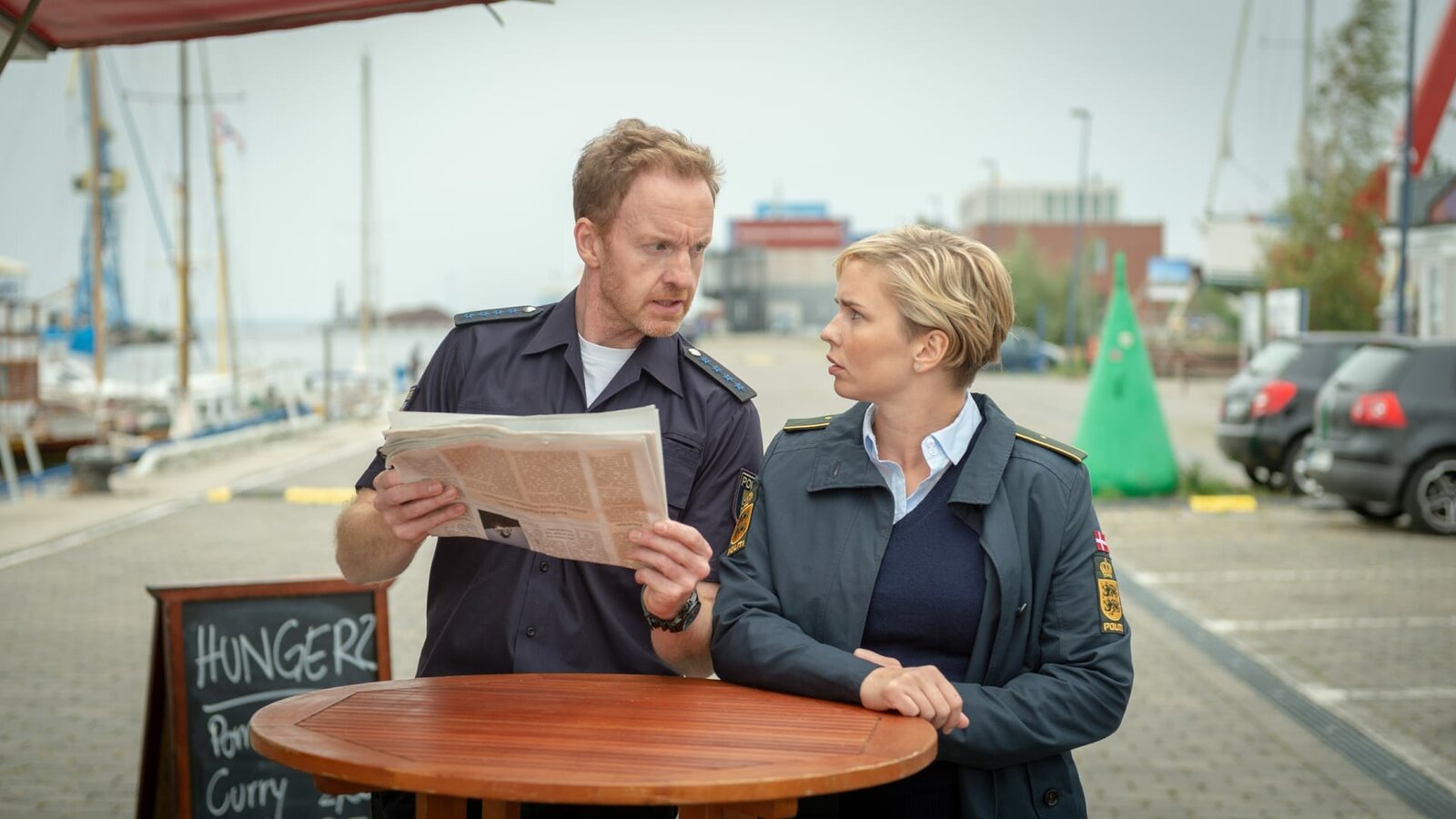 Ich warte auf dichTimmermann (Mathias Junge, l.) und Stine (Sidsel Hindhede, r.) machen sich rar, damit ihnen von den Kollegen nicht immer nur die langweiligen Fleißaufgaben aufgedrückt werden. Doch dann finden sie in der Tageszeitung ein fehlendes Puzzlestück zum Fall. Finden die Ermittler nun endlich den Täter?Bild: © ZDF / Marc Meyerbroeker Lizenzbild frei
