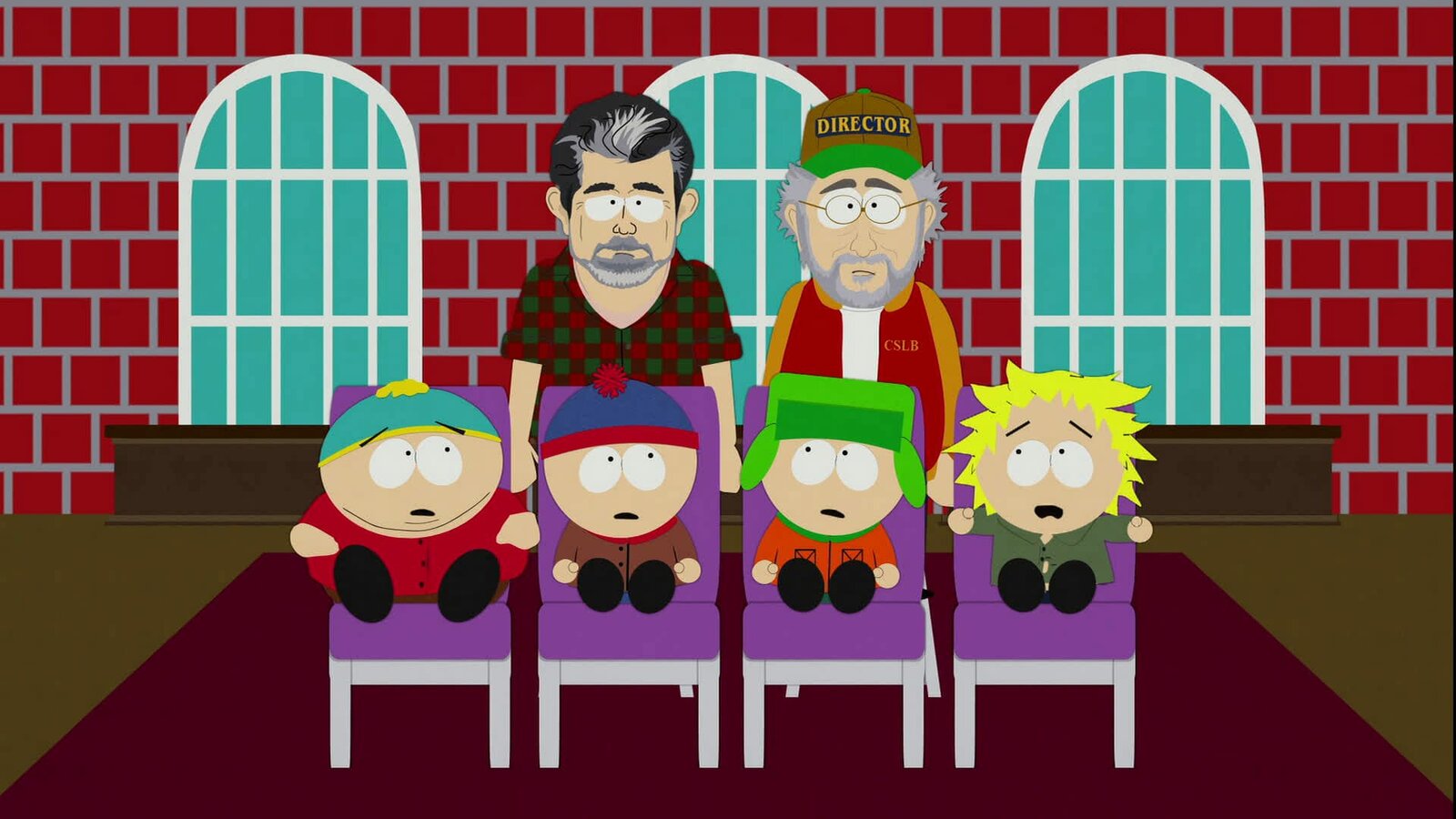 Größer, digitaler und umgeschnitten!Vorne, l-r: Eric, Stan, Kyle, Tweek. Hinter, l-r: George Lucas, Steven Spielberg.Bild: © ViacomCBS
