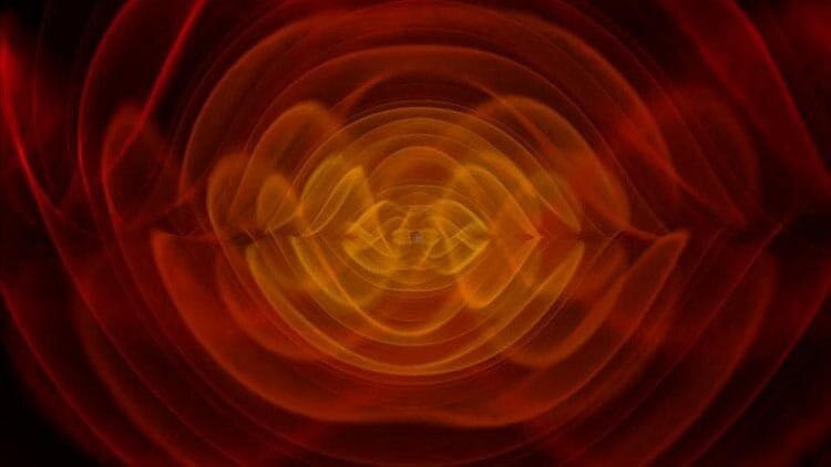 Gravitation - Kraft, die alles zusammenhältDieses Bild der NASA zeigt eine Simulation von Gravitationswellen, entstanden durch die Kollision zweier Schwarzer Löcher.Bild: © N24 Doku