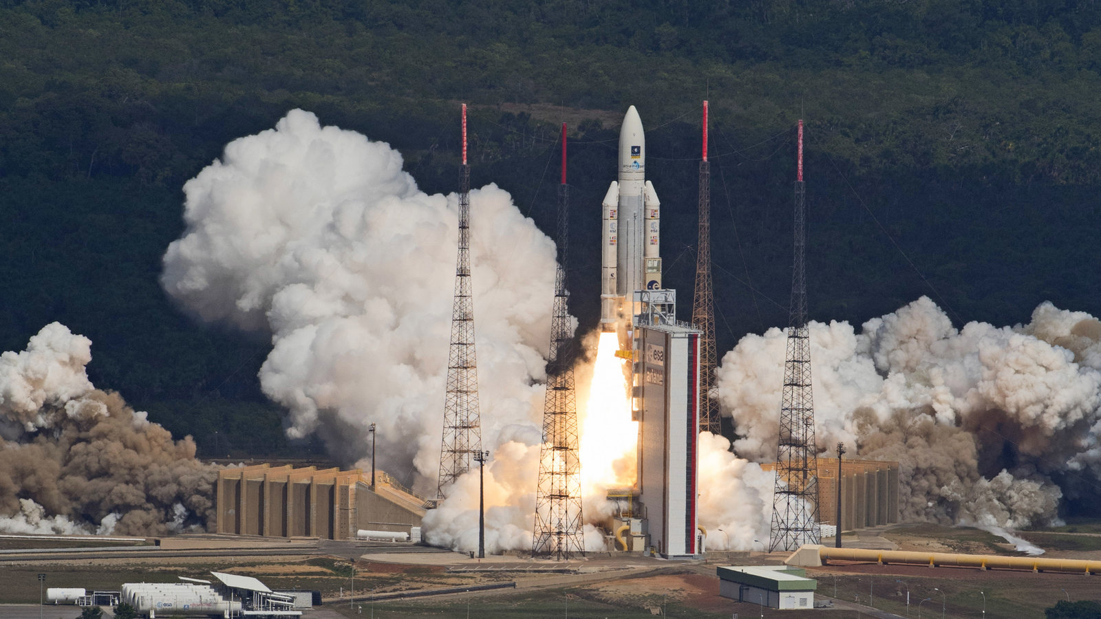 Europa im All - Raumfahrt ohne GrenzenBildunterschrift: Die Ariane 5 hebt auf dem Weltraumbahnhof Kourou in Französisch-Guyana ab.Bild: © N24 Doku