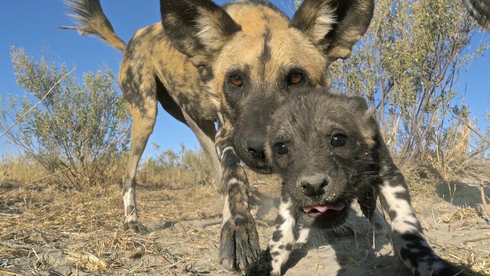 Große GefühleWildhunde in extremer Nahaufnahme, gefilmt vom Welpen-Roboter in Botswana.Bild: © ZDF und Philip Dalton