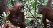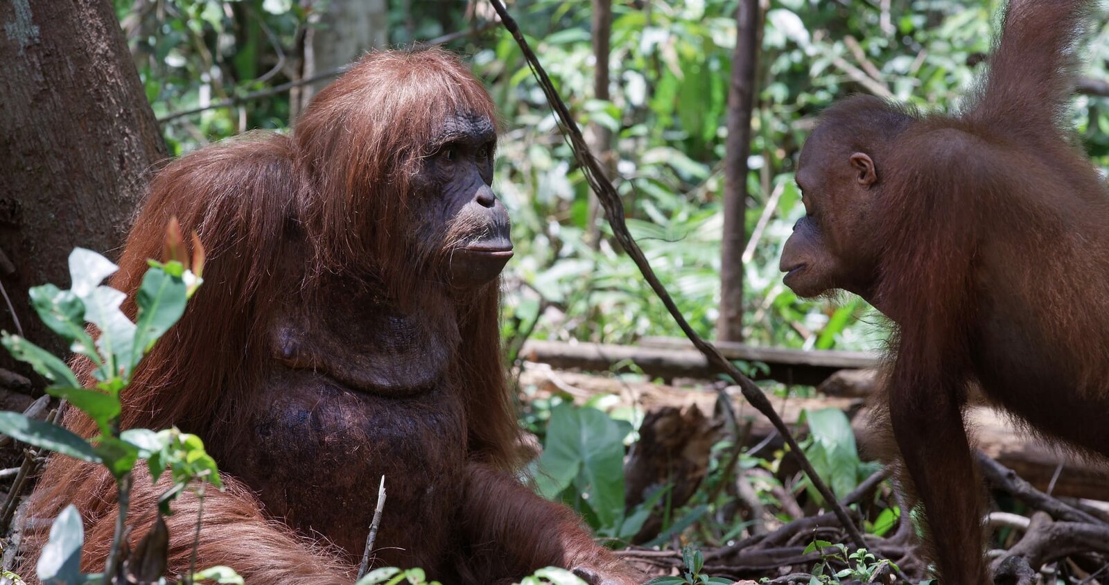 Schlaue KöpfeJunger Orang-Utan (r.) trifft auf Roboter-Orang-Utan (l.) im Wald von Borneo.Bild: © ZDF und Stephen Downer