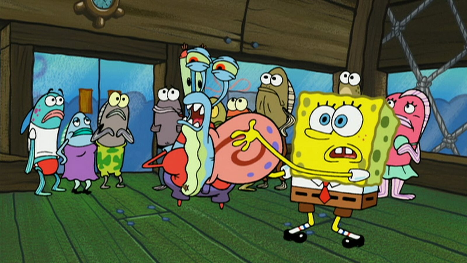 Imitatorenvorne: Squidward (3.v.l.), SpongeBob (2.v.r.), Patrick (r.)Bild: © ViacomCBS
