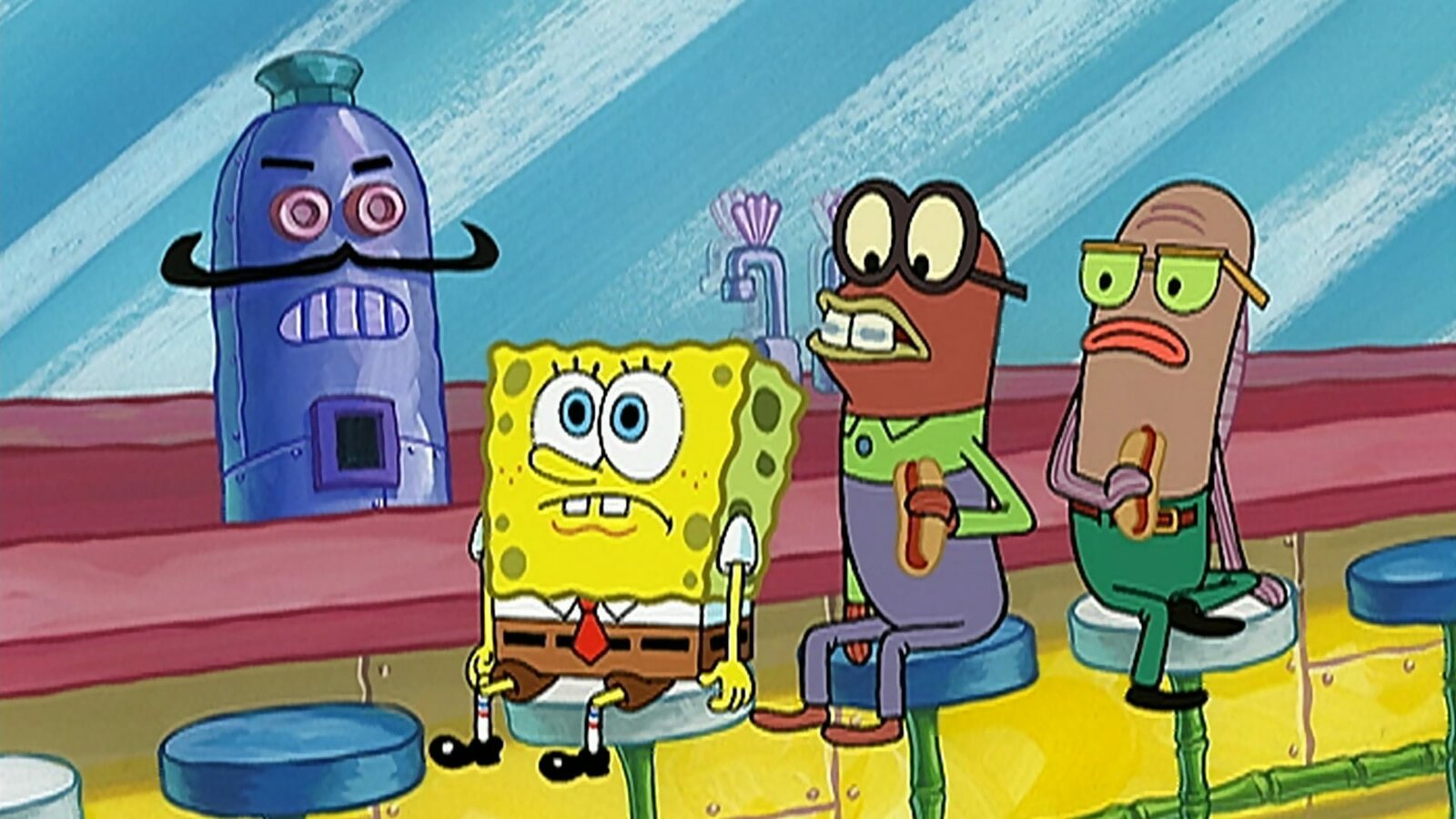 Harte JungsL-R: Animatronic server, SpongeBob, Weenie 1, Weenie 2Bild: © ViacomCBS