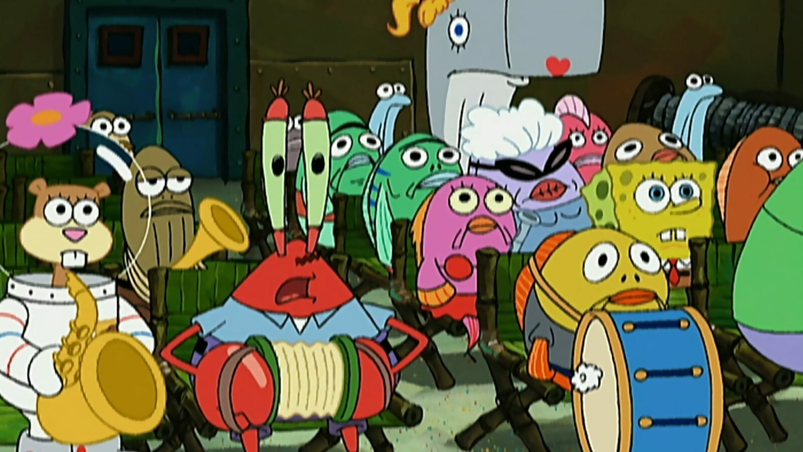 Hör' mal, wer da spieltSandy (l.), Mr. Krabs (3.v.l.)Bild: © ViacomCBS