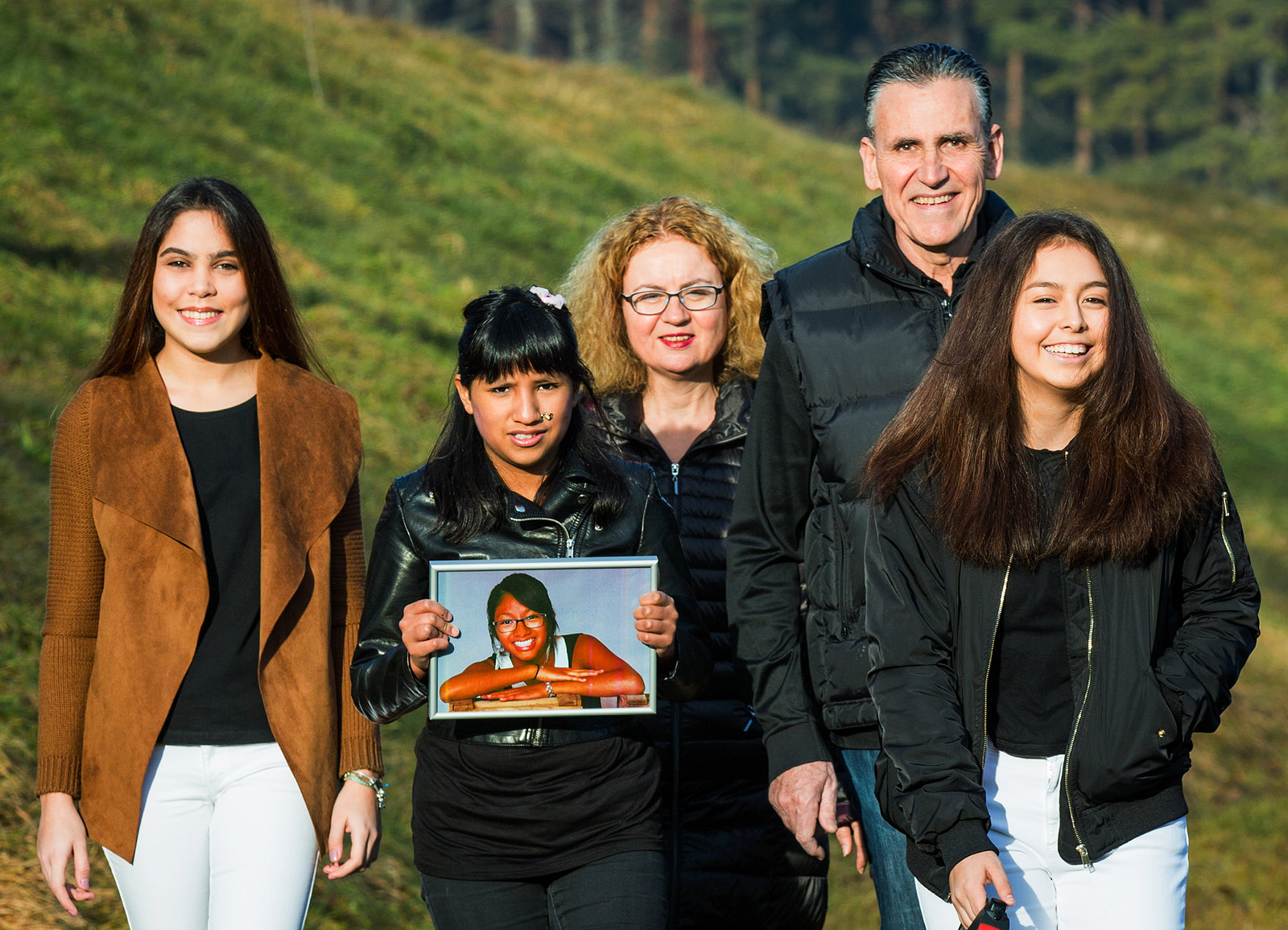 Familiensache (3)Familie Hunkeler Flück: Paulina Gongora, Yuri Hunkeler mit einem Bild von Carmela Hunkeler, Denise Hunkeler Flück, Viktor Hunkeler und Atalia Hunkeler mit Hund TheresBild: © SRF/Marcus Gyger