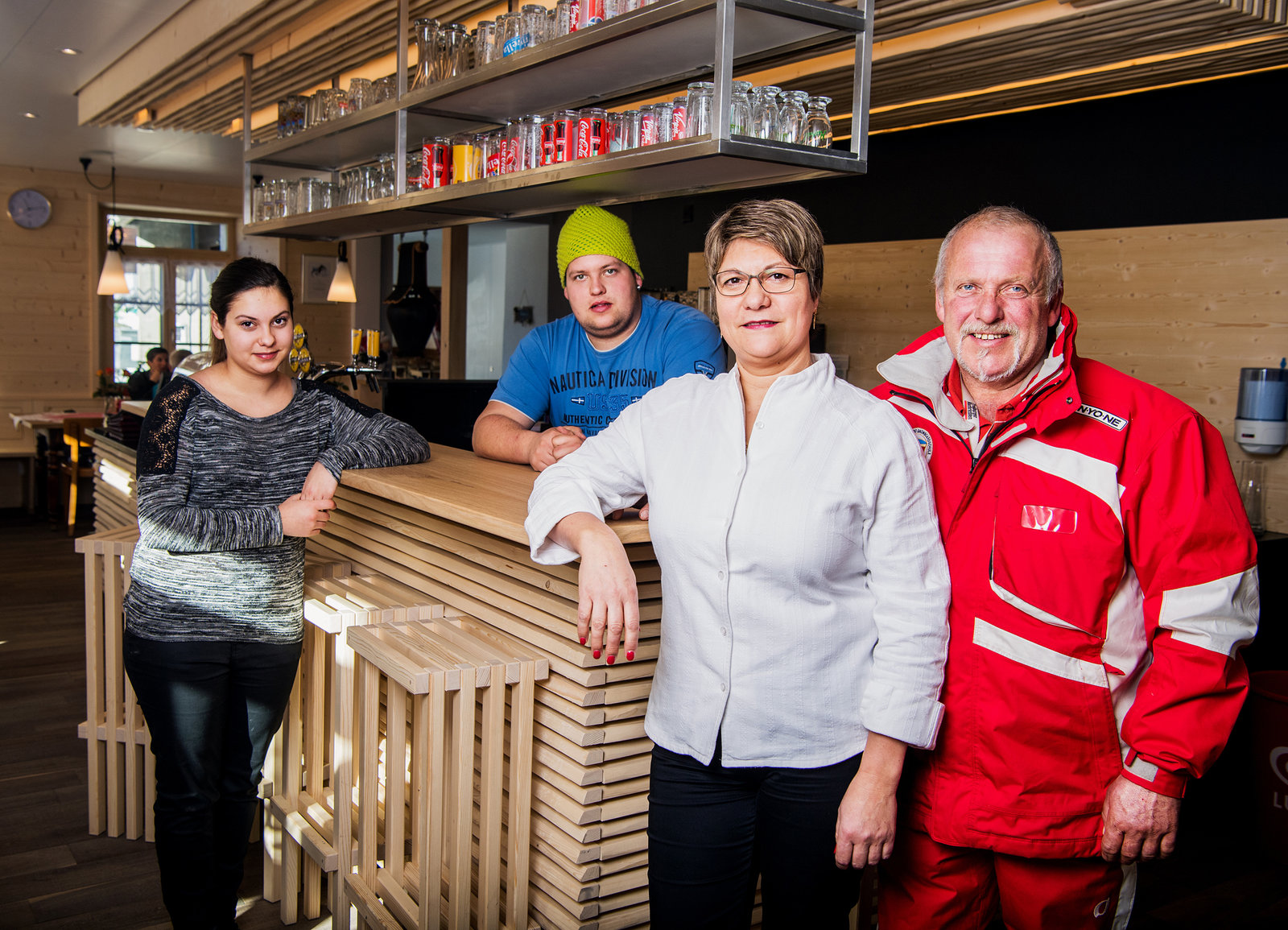 Unser Dorf: Jaun (3)Madalena, Tiago, Carmo und Gerold Rauber im Hotel «Wasserfall»Bild: © SRF/Peter Mosimann