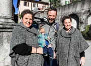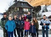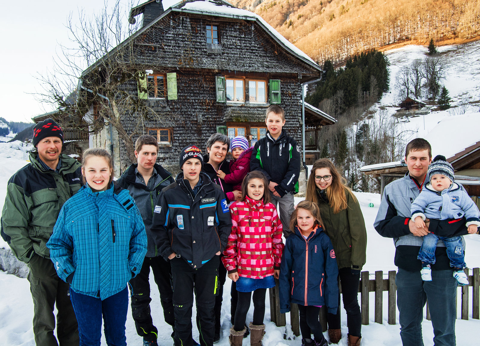 Unser Dorf: Jaun (1)Grossfamilie Buchs vor ihrem Haus : Patrick, Ivana, Emmanuel, Stefan, Monika, Carina (auf d. Arm), Magaly, Yanick, Christelle (blaue Jacke), Ramona, Samuel, Lukas (auf d. Arm)Bild: © SRF/Peter Mosimann