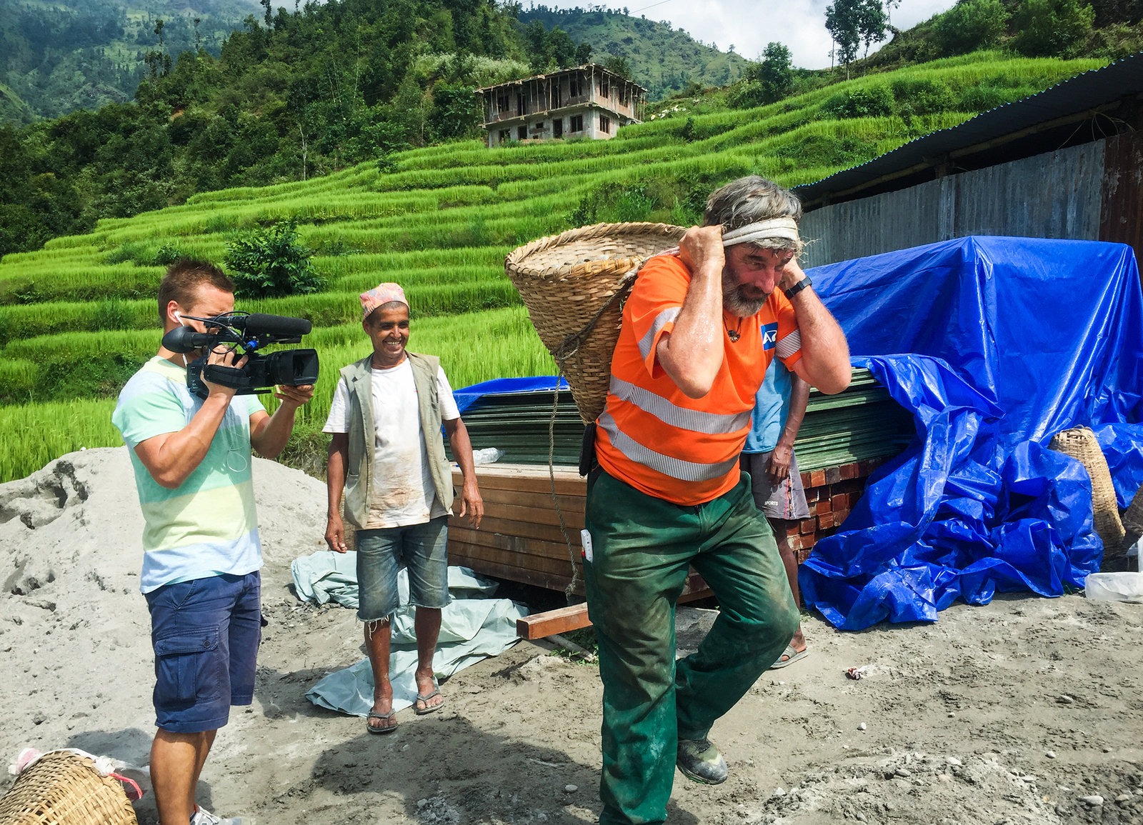 Unser Dorf: Jaun (4)Felix Thürler (r.) transportiert einen 70 kg schweren Korb : begleitet von SRF-VJ Jan Fitze und einem EinheimischenBild: © SRF