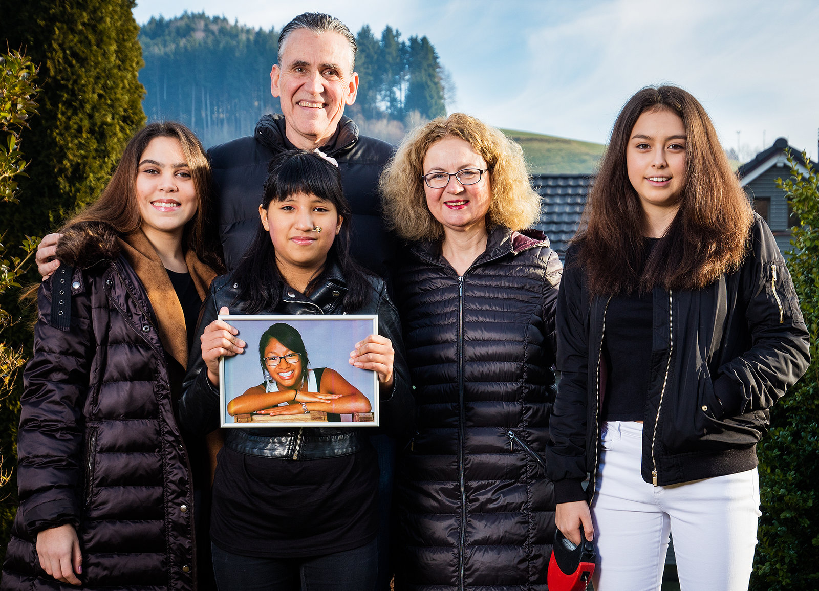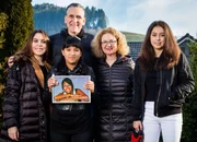 Unser Dorf: Tenna (5) Der grosse MomentFamilie Hunkeler Flück : Paulina Gongora, Viktor Hunkeler, Yuri Hunkeler mit einem Bild von Carmela Hunkeler, Denise Hunkeler Flück und Atalia Hunkeler mit Hund TheresBild: © SRF/Marcus Gyger