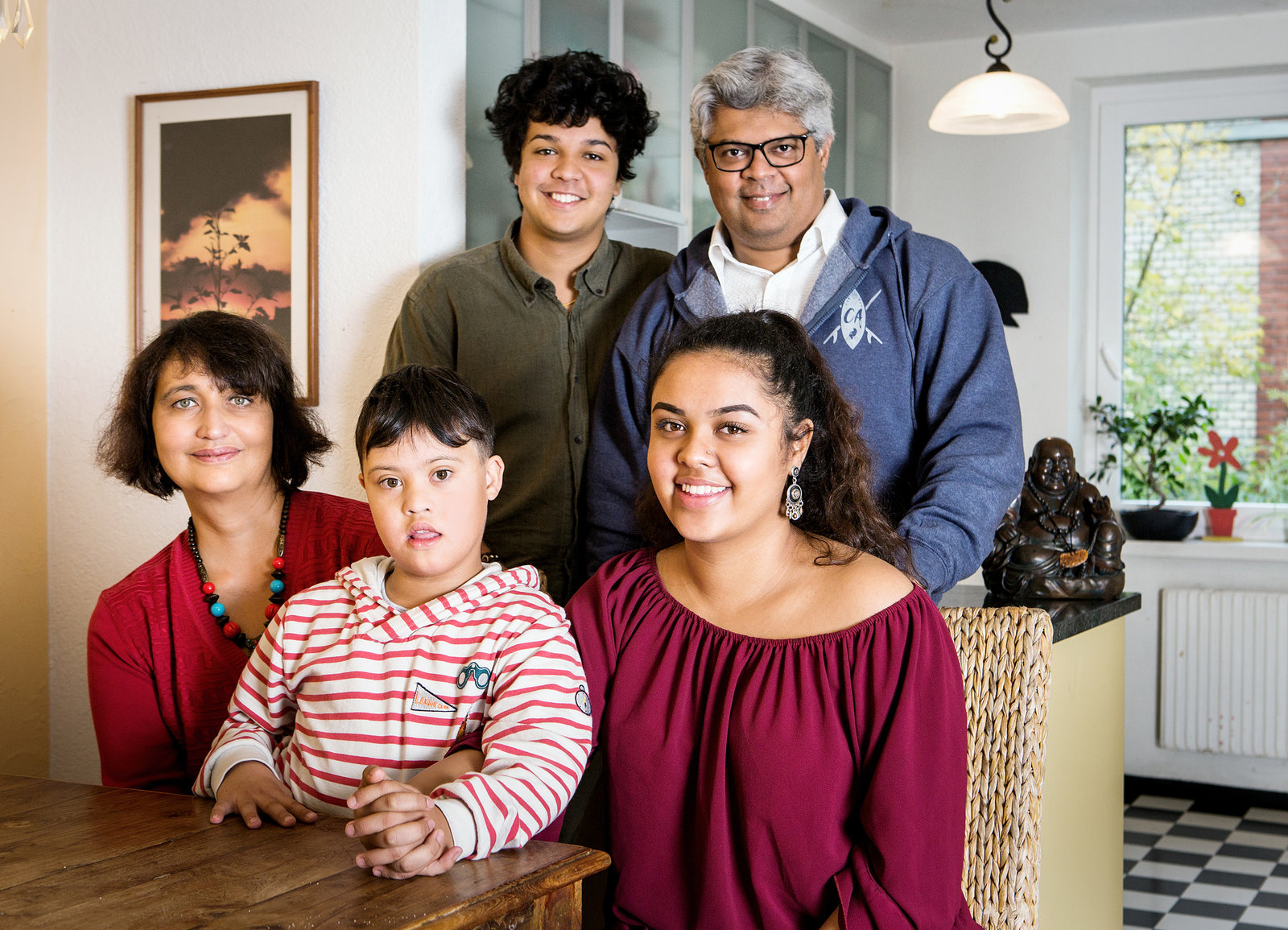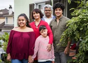 Familiensache (4)Familie Hosali: Tamara Papst Hosali (Mutter), Rishi Hosali (gestreifter Pulli), Louis Hosali (Junge mit grauem Shirt), Manisha Hosali (Tochter mit bordeauxfarbenem Shirt), Rajesh Hosali (Vater)Bild: © SRF/Marcus Gyger