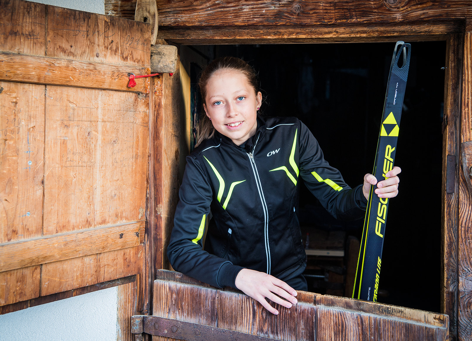 Unser Dorf: Jaun (2)Anina Buchs mit ihren LanglaufskiernBild: © SRF/Peter Mosimann