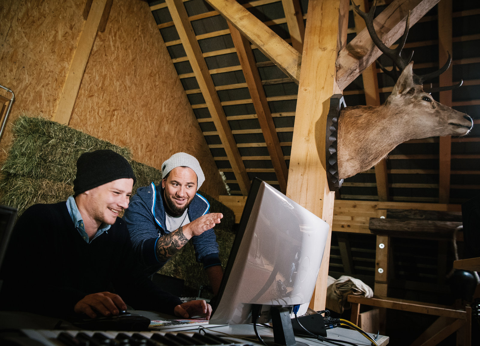 Heimatsound (1)Produzent Dave Hofmann und Marc Trauffer im zum Studio umfunktionierten HeustallBild: © SRF/Peter Mosimann