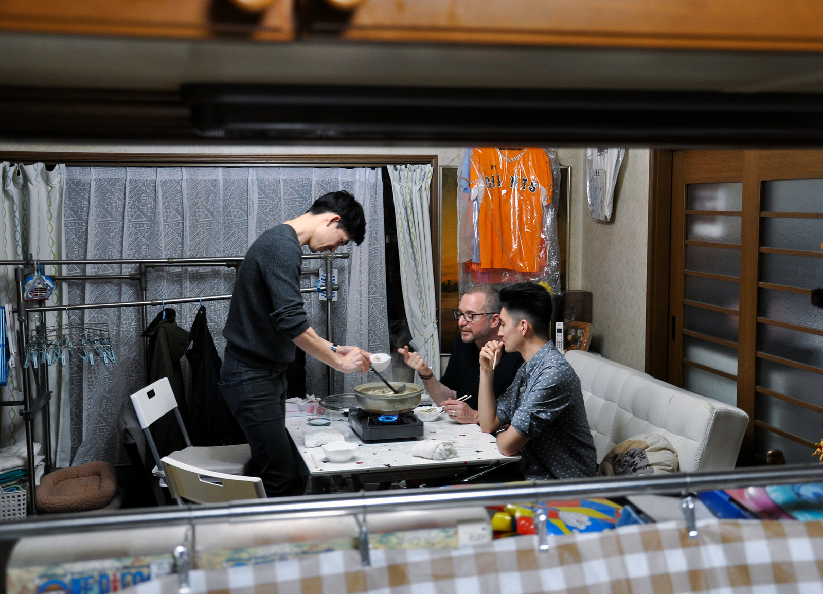 Fokus Japan - Unterwegs mit Patrick Rohr - Hektische Megacity, erholsame Landidylle und faszinierende Essregeln (1)Hausmannskost: Fischverkäufer Yukinobu Takanashi kocht Nabe mit Patrick Rohr und Übersetzer Dennis GinsigBild: © SRF/Reto Vetterli