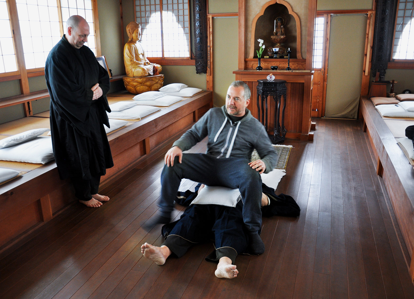 Fokus Japan - Unterwegs mit Patrick Rohr (3)Im Zen-Tempel: Roshi Gensho Hozumi hebt Patrick Rohr mit der Energie, die er im Bauch konzentriertBild: © SRF/Reto Vetterli