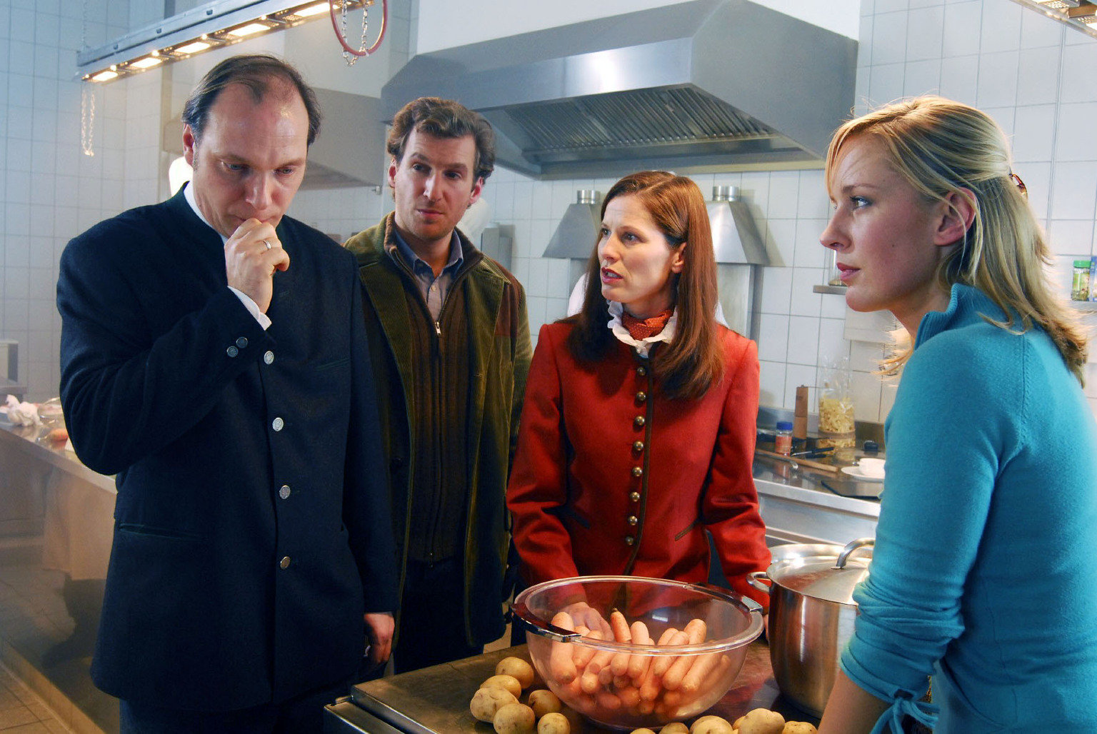 Ein gewaschener MordMark (Siegfried Terpoorten, 2.v.l.) und Rebecca (Lilian Klebow, r.) befragen Gudrun Wittke (Heidrun Gärtner, 2.v.r.), die Hotelbesitzerin, und Xaver Wittke (Martin Brambach, l.), den Geschäftsführer und Bruder des Toten Georg. Als Mark erwähnt, dass dieser einen Drohbrief erhalten hat, hat Xaver eine Ahnung ...Bild: © SAT.1 Eigenproduktionsbild frei
