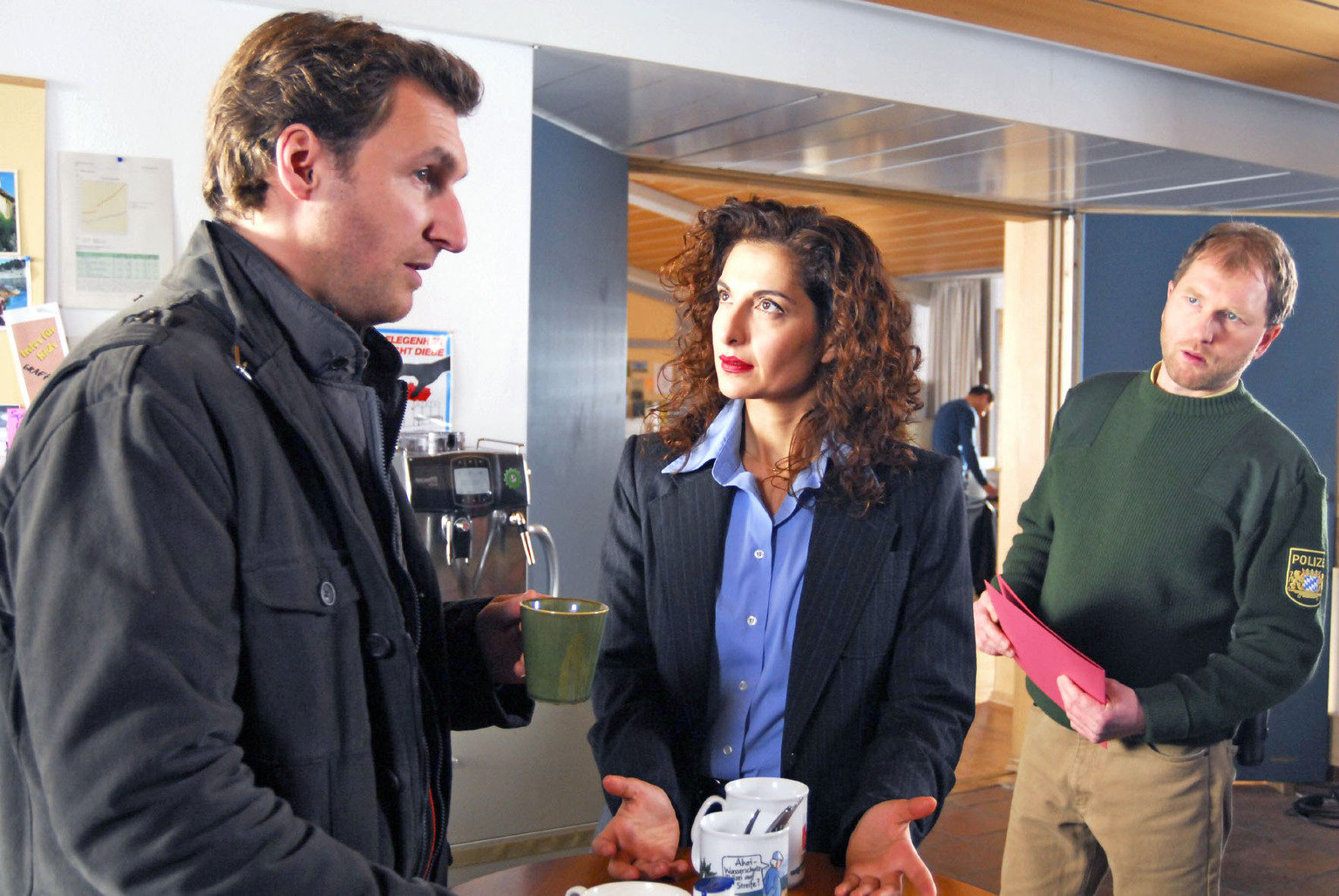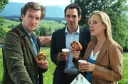 Ein gewaschener MordMark (Siegfried Terpoorten, M.) und Rebecca (Lilian Klebow, r.) kommen aus dem Verhörraum. Mark braucht von Schorsch (Andreas Schweiger, l.) eine Liste aller Angestellten aus dem Rathaus, denn wahrscheinlich war der Tote mit einer der Angestellten liiert. Rebecca amüsiert sich über die Eifersucht, die nun scheinbar jeden Murnauer Mann ergriffen hat ...Bild: © Sat.1 / Hans Seidenabel