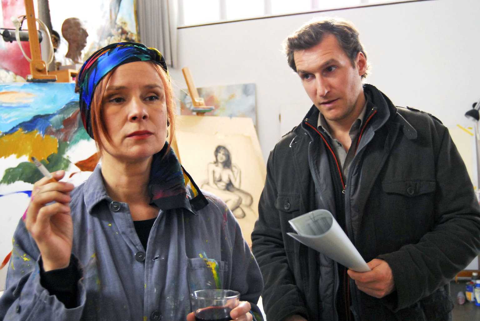 Ein gewaschener MordRebecca (Lilian Klebow, l.) ist eingeschüchtert und verhält sich bei den Ermittlungen im Fall Georg Wittke betont arglos. Sie will auf keinen Fall, dass Mark (Siegfried Terpoorten, r.) erfährt, dass Murnaus ausgebuchter Physiotherapeut sie, wie viele andere Frauen auch, nicht nur auf der Massageliege verwöhnt hat ...Bild: © Sat.1 / Hans Seidenabel