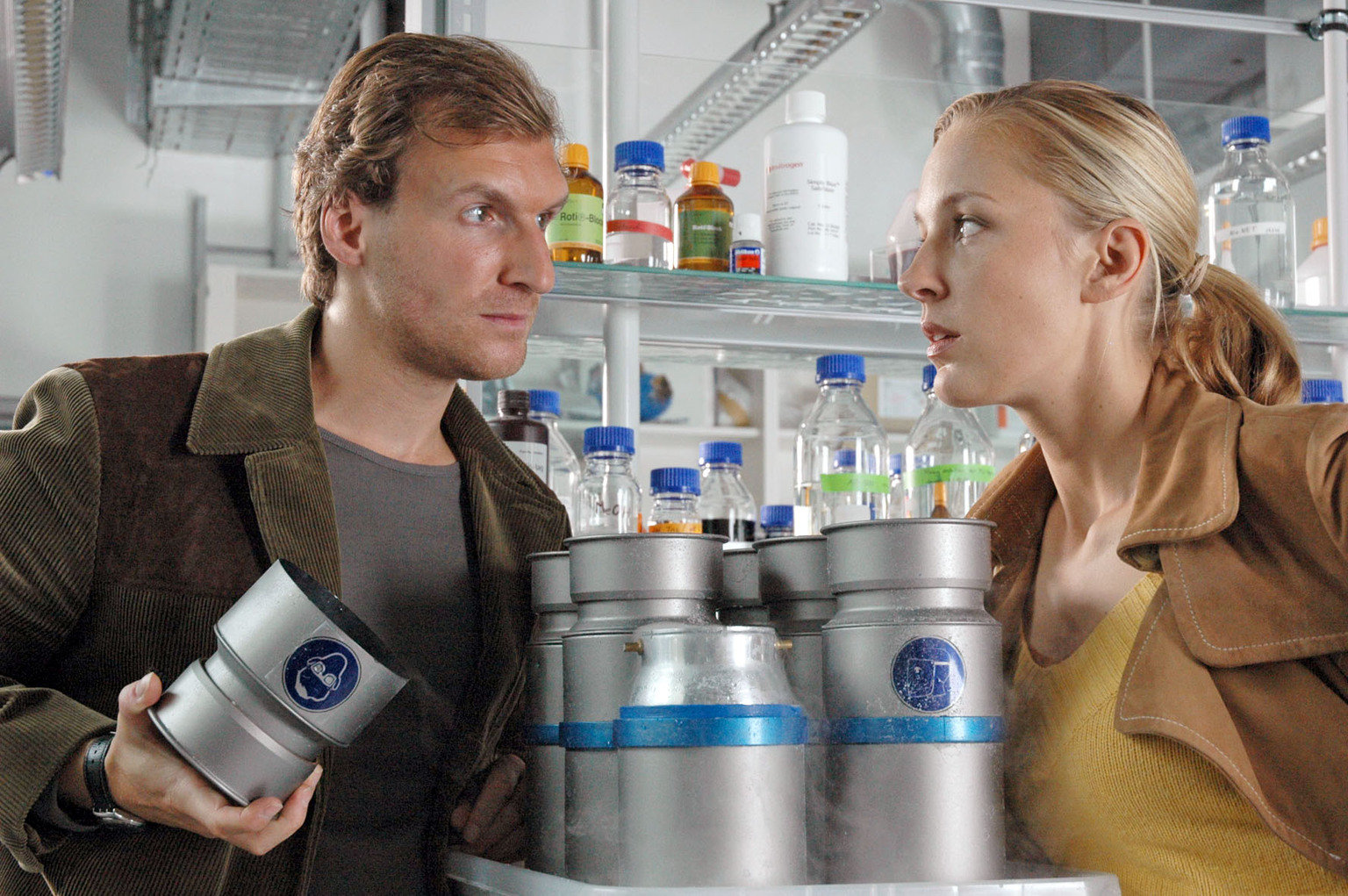 Auf Eis gelegtDer Bürgermeister von Murnau wird ermordet und mit befruchteten Eizellen auf seinem Arm gefunden, die seine Gene tragen. Marc (Siegfried Terpoorten, l.) und Rebecca (Lilian Klebow, r.) ermitteln in dem embryologischen Institut, das die Eizellen eigentlich vernichten sollte...Bild: © Sat.1 / Kerstin Stelter