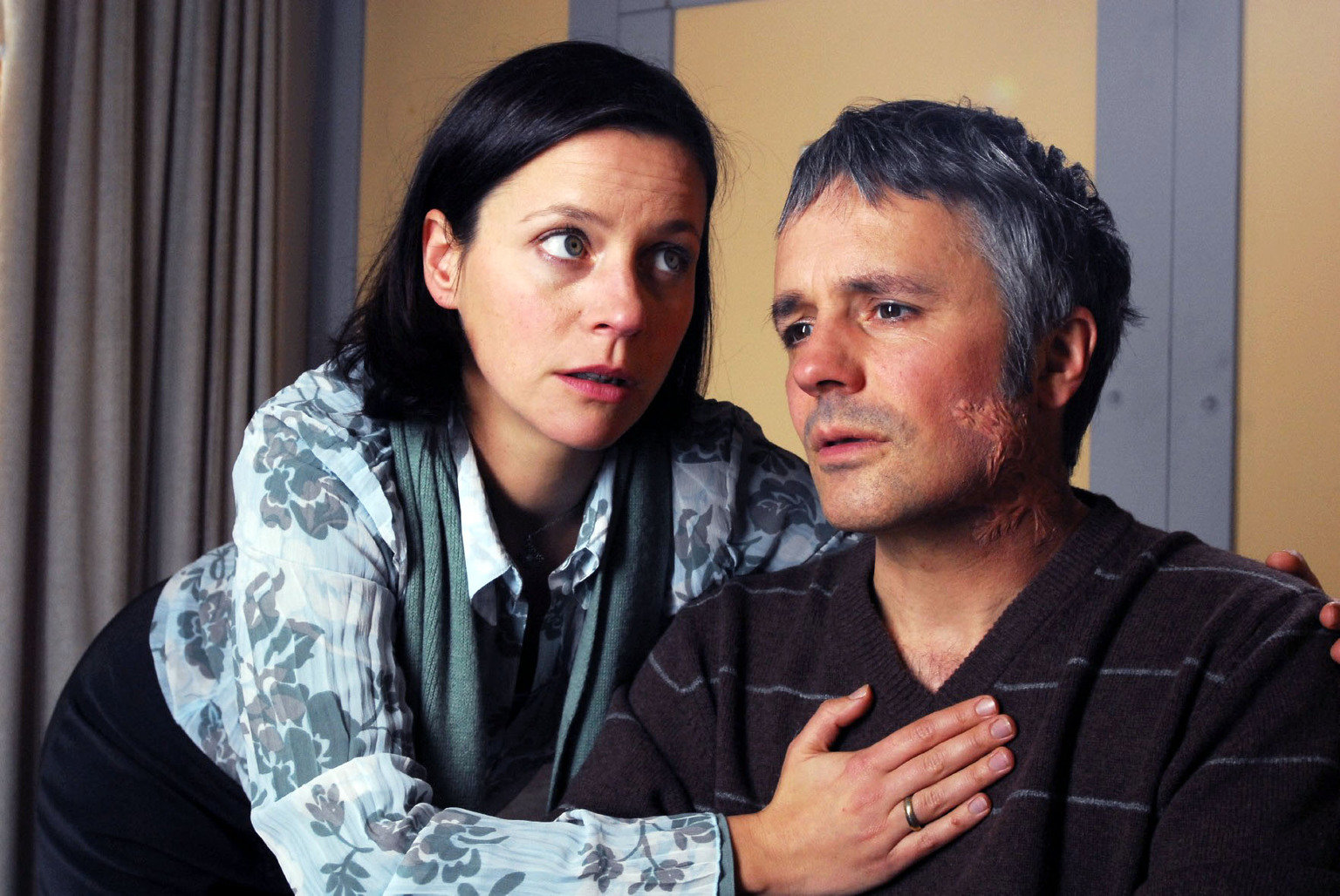 Ein gewaschener MordDie Ermittlungen führen Mark und Rebecca zu einem potenziellen Mörder, einem betrogenen Ehemann, Franz Stenzel (René Hofschneider, r.). Doch die Sache ist heikel: Der Verdächtige leidet am Verlust des Kurzzeitgedächtnisses. Seine Frau Verena (Jule Ronstedt, l.) steht ihm zur Seite, als er einwilligt sich in Hypnose versetzen zu lassen. Franz will endlich herausfinden, ob er wirklich der Mörder von Georg Wittke ist ...Bild: © Sat.1 / Hans Seidenabel