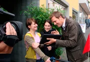 Moderator Jens Hübschen (re.), will testen, will wissen, was die Mitmenschen so wissen über ihre Stadt und ihr Land. In seinem kleinen Laptop hat er Fragen und Filme dabei und so können willige Mitspieler auf der Stelle spielen und punkten.Bild: © SWR / SWR Presse/Bildkommunikation