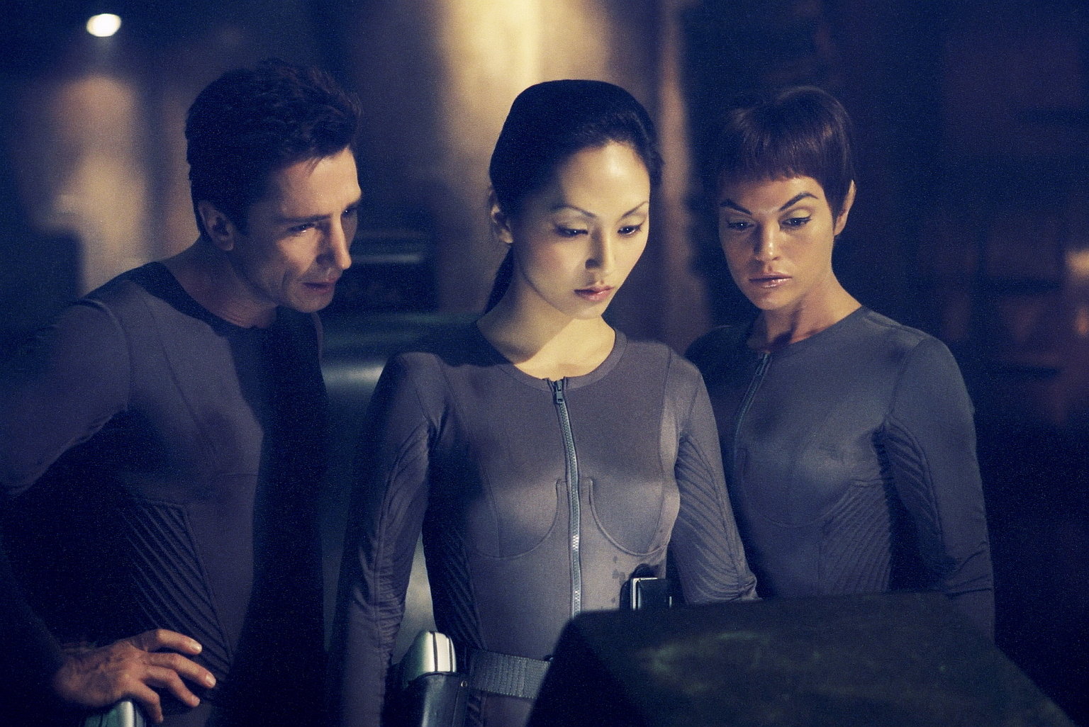 Schlafende HundeSie versuchen, ein defektes klingonisches Raumschiff wieder fahrtüchtig zu machen: Hoshi (Lina Park, M.), Lt. Reed (Dominic Keating, l.) und T’Pol (Jolene Blalock, r.) ...Bild: © Paramount Pictures Corporation Lizenzbild frei