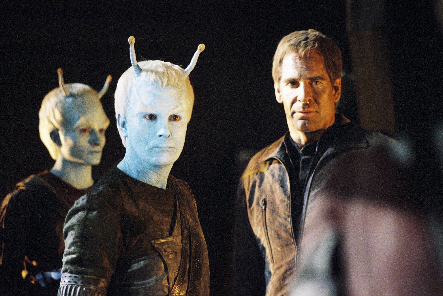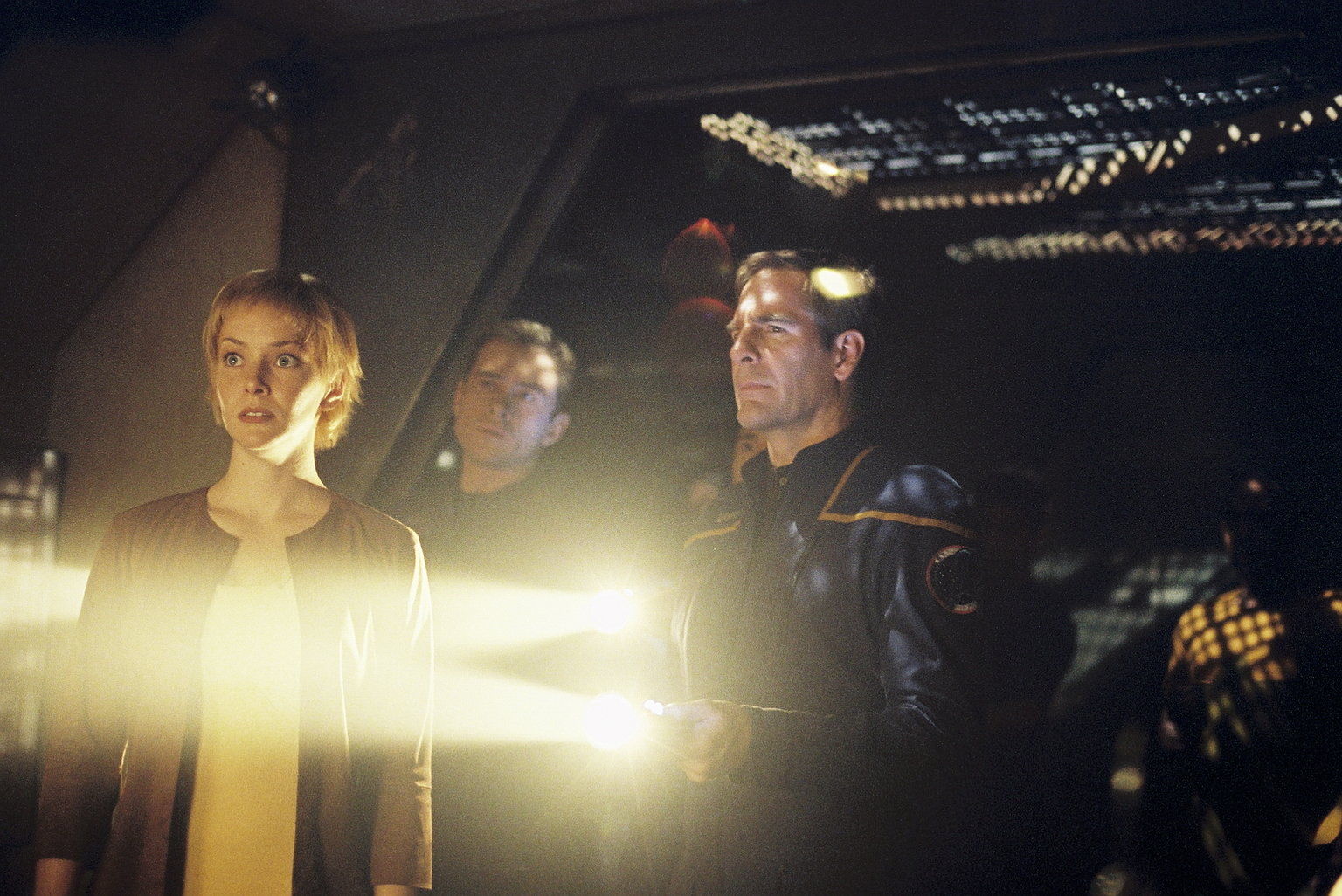 Schiff der GeisterCaptain Archer (Scott Bakula, r.) und Trip (Connor Trinneer, M.) sind bereit, Liana (Annie Wersching, l.) gegen ihre Familie zu verteidigen.Bild: © Paramount Pictures Corporation Lizenzbild frei
