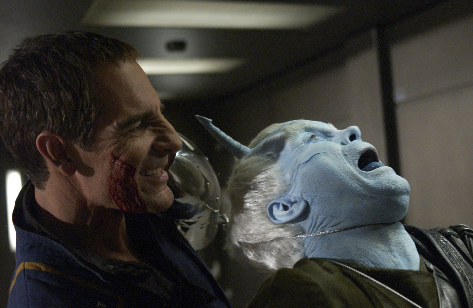 VereinigtArcher (Bakula Scott, l.) erklärt sich bereit, gegen Shran (Jeffrey Combs, r.) zu kämpfen und tatsächlich gelingt es ihm, Shran zu überwältigen, aber statt ihn zu töten schlägt er ihm einen Teil einer Antenne ab ...Bild: © Paramount Pictures Lizenzbild frei