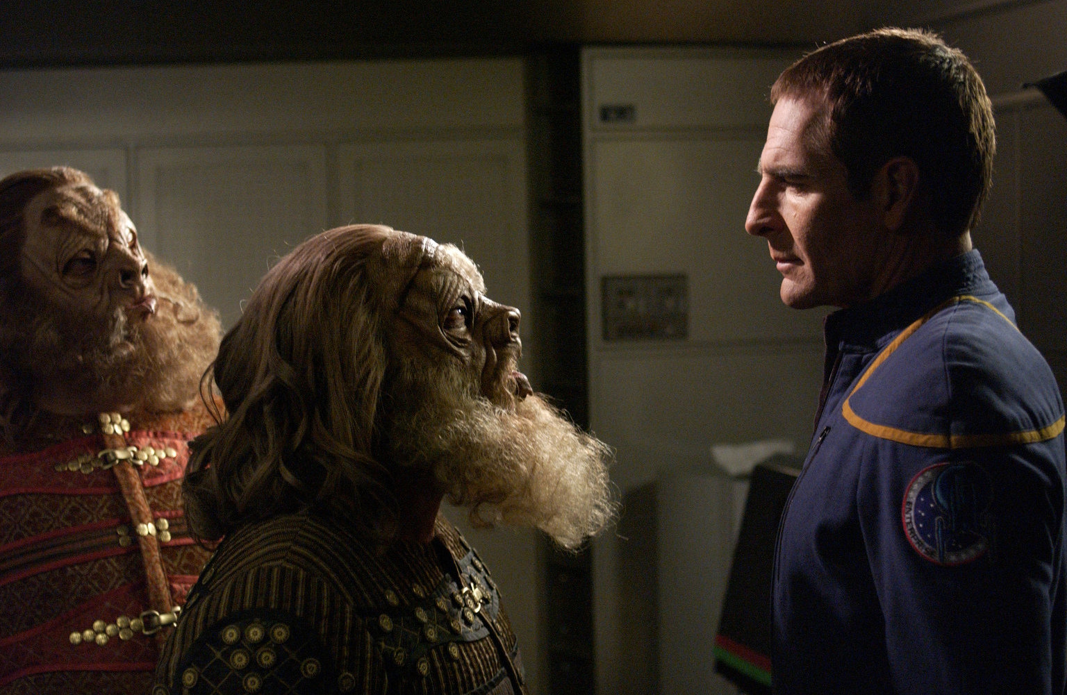 WaffenstillstandVon seinem alten Freund Shran wird Captain Archer (Scott Bakula, r.) gebeten, den Adorianern zu helfen, einen Streit mit den Vulkaniern um einen strategisch günstig liegenden Planeten zu schlichten ...Bild: © Paramount Pictures Lizenzbild frei