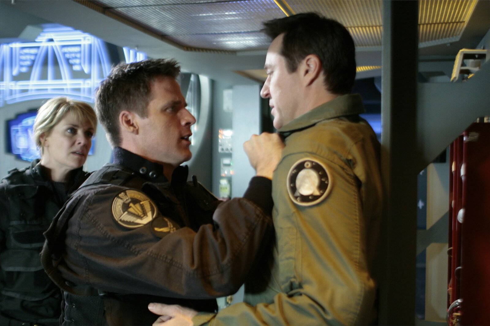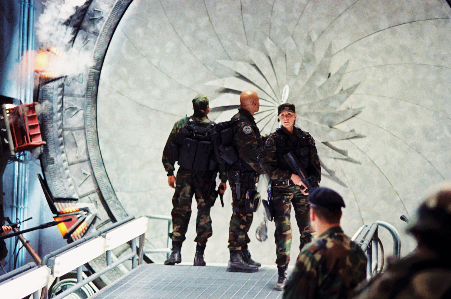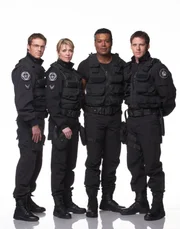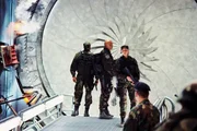 Der fünfte MannSam (Amanda Tapping, r.), Daniel (Michael Shanks, l.) und Teal'c (Christopher Judge, M.) können sich nach einem Jaffa-Angriff auf die Erde retten und erstatten Bericht. O'Neill bleibt auf dem Planeten mit einem Leutnant zurück, an den sich in der Stargate Zentrale keiner erinnert ...Bild: © MGM GLOBAL HOLDINGS INC.. All Rights Reserved Lizenzbild frei