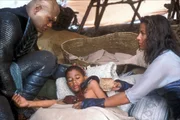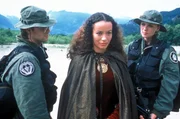 BlutsbandeTeal'c (Christopher Judge, l.) hat auf seinem Heimatplaneten Chulak eine Familie. Da ein wichtiges Ereignis bevorsteht reist er zu seinem Sohn Rya'c (Neil Denis, M.) und seiner Frau Drey'auc (Salli Richardson-Whitfield, r.) ...Bild: © MGM Worldwide Television Productions Inc. Lizenzbild frei