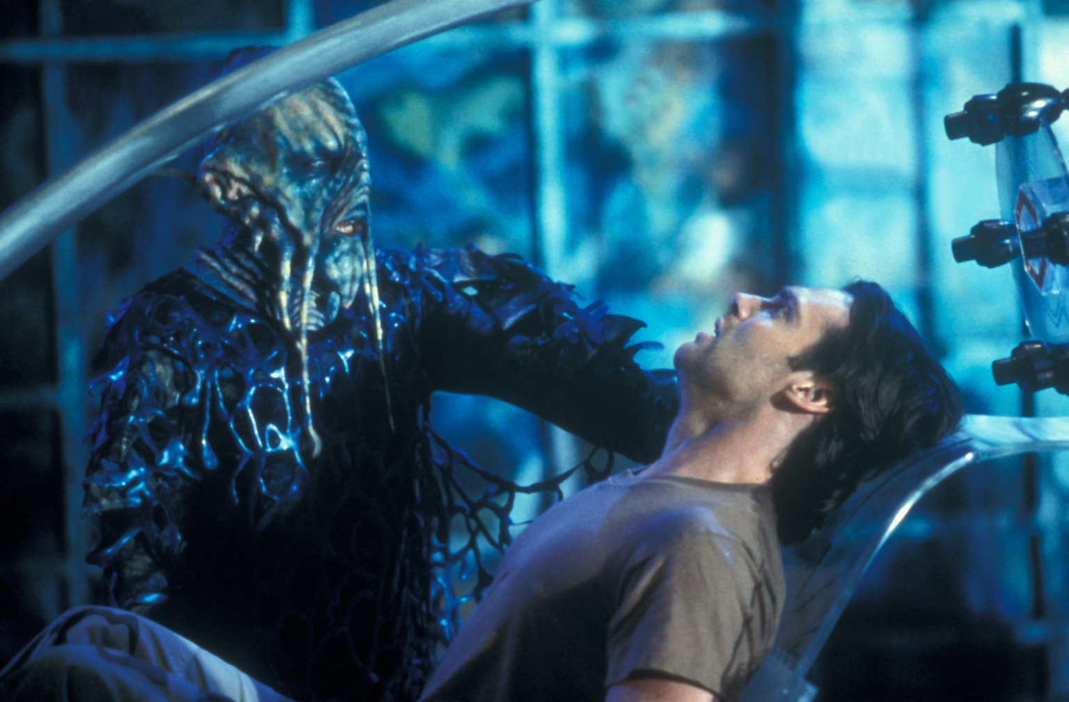 Feuer und WasserDas SG1-Team glaubt, dass Daniel Jackson (Michael Shanks, r.) bei einem Vulkanausbruch auf dem Planeten Oannes ums Leben gekommen ist. Doch Daniel ist nicht tot - er wird vom amphibischen Außerirdischen Nem (Gerard Plunkett, l.) gefangen gehalten ...Bild: © MGM Worldwide Television Productions Inc. Lizenzbild frei