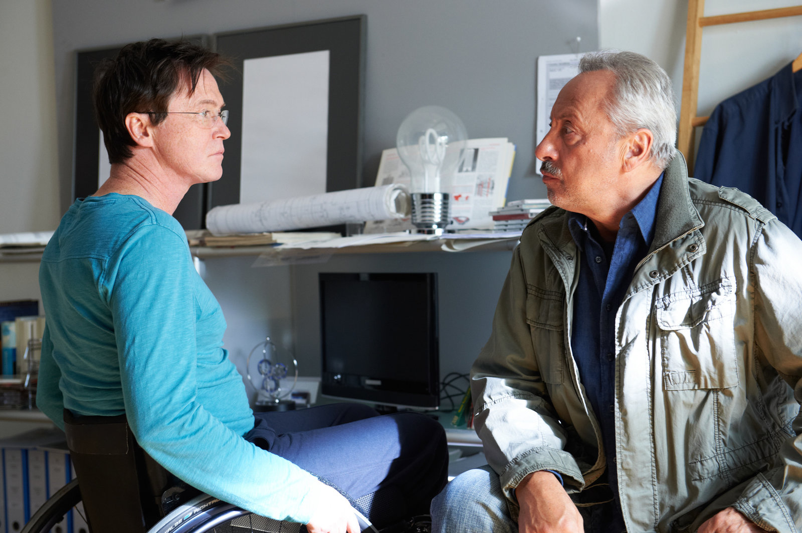 BegleiterinnenSo ganz ist Stubbe (Wolfgang Stumph, r.) noch nicht davon begeistert, dass Helge (Wanja Mues, l.) nun wieder mit seiner Tochter zusammen ist.Bild: © ZDF und Sandra Hoever