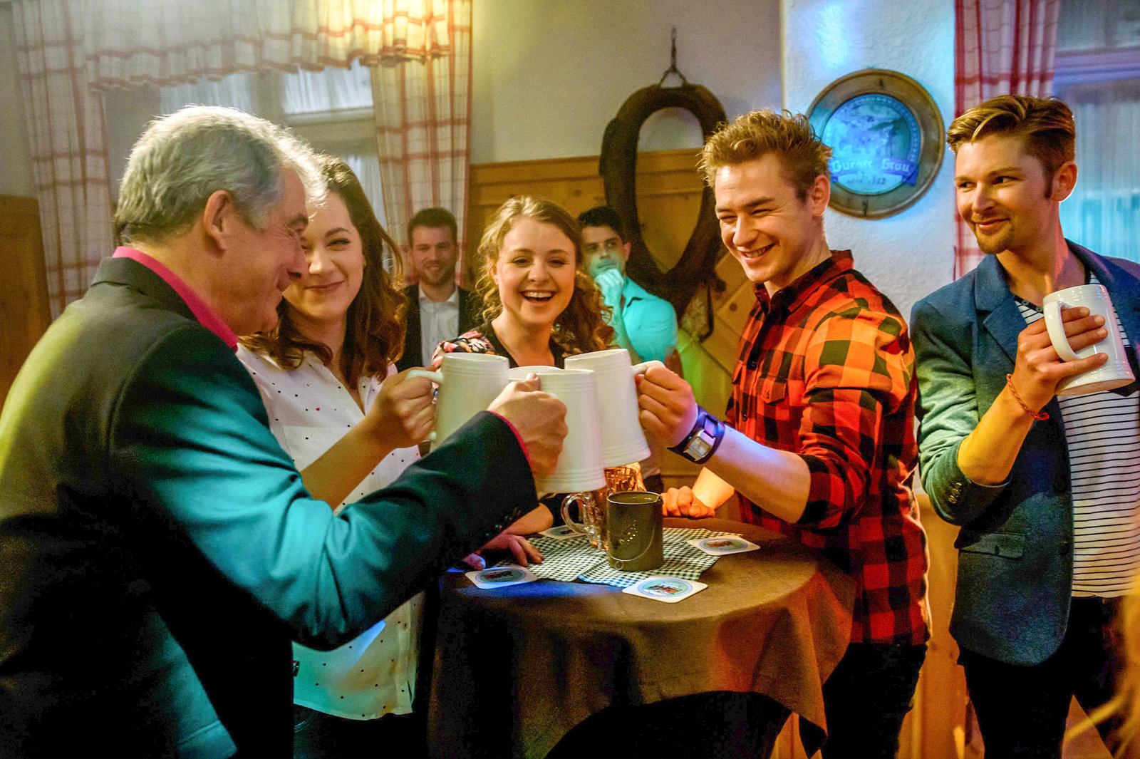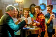 Abschied von Norman und AnniNorman (Niklas Löffler, 2.v.r. mit Komparse, r.) und Anni (Regina Fink, M.) feiern zusammen mit Tina (Christin Balogh, 2.v.l.) und André (Joachim Lätsch, l.) ihre Abschiedsparty.Bild: © ORF